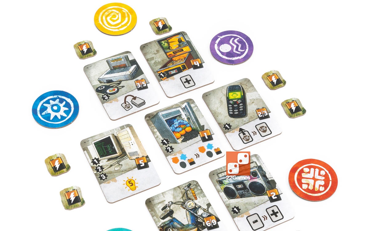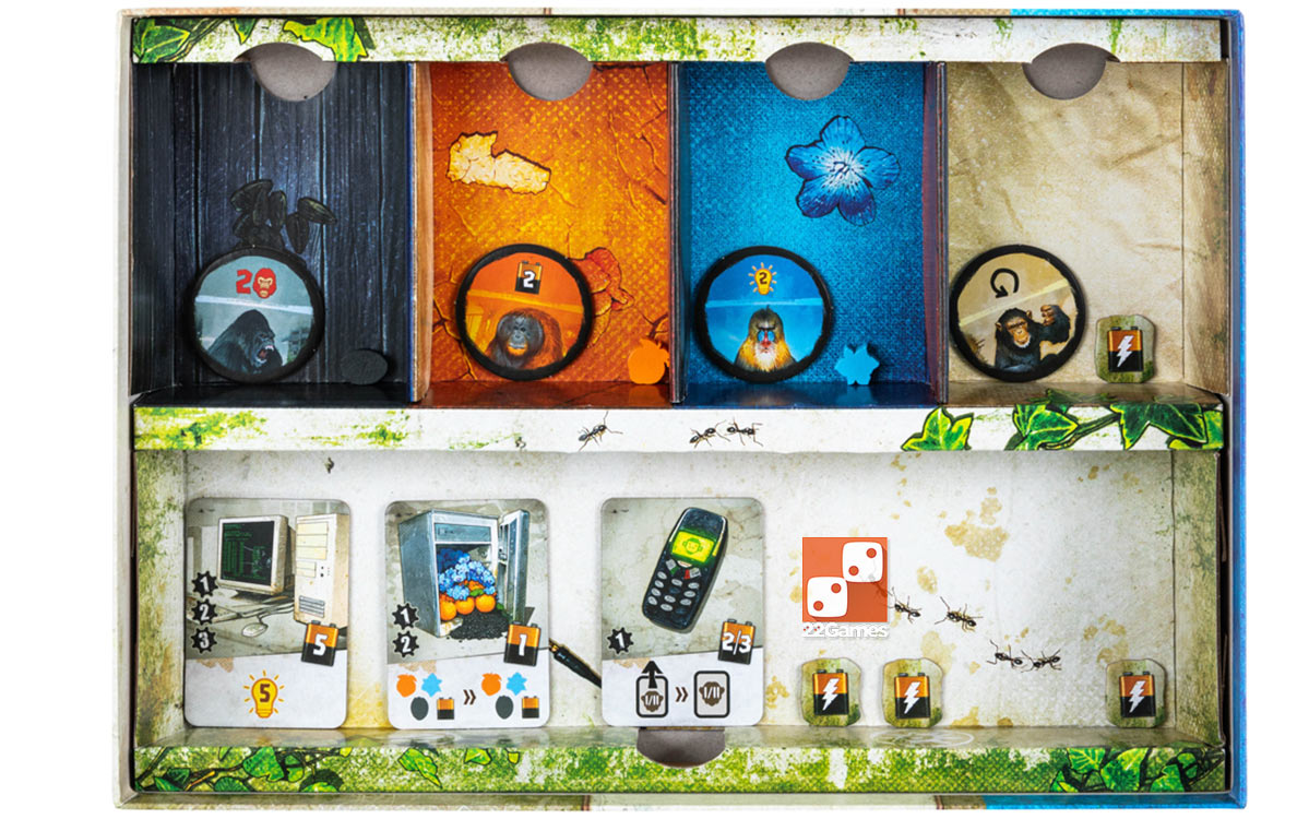 1. Сбор племени. Все игроки одновременно открывают 4 верхние карты своих стопок и затем выкладывают их в любом порядке на столе перед собой — это их племена обезьян. Как только карты выложены, игроки применяют эффекты всех закрытых рамок на картах своего племени. Применение эффектов рамок начинается с верхнего ряда и слева направо. Некоторые рамки сразу приносят ресурсы или ПО, другие же требуют от игрока выполнить определённое условие, чтобы воспользоваться эффектом.