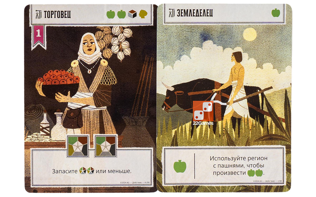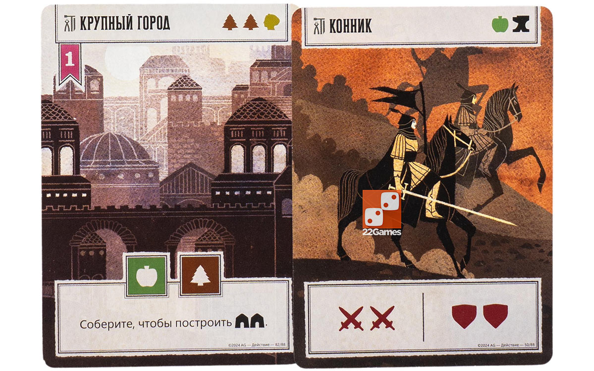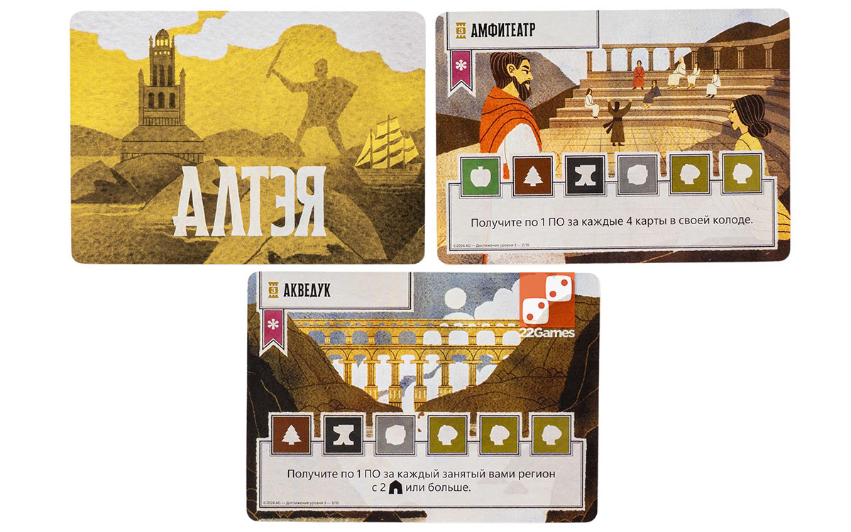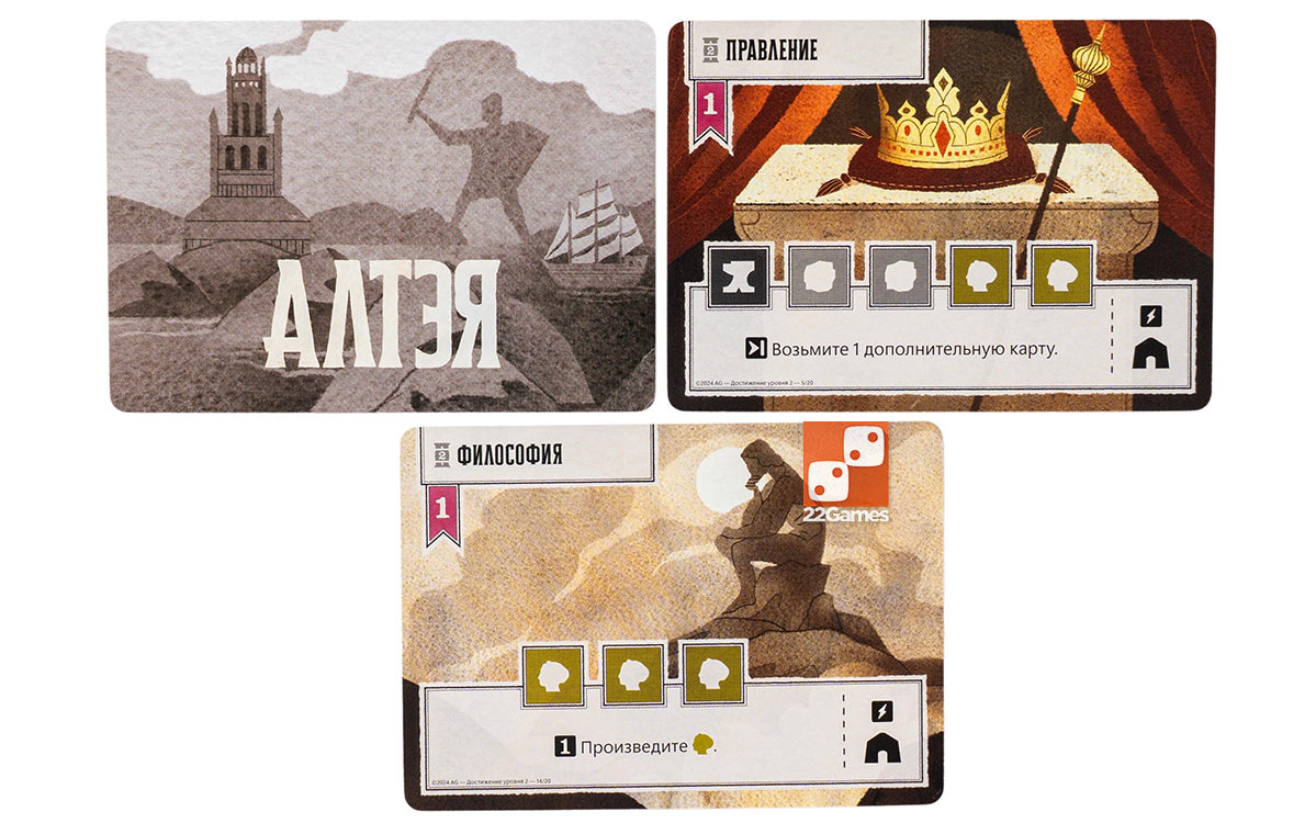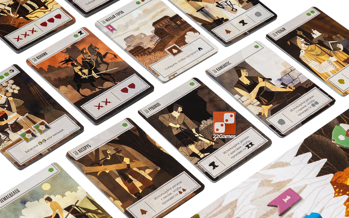Вы будете разыгрывать карты, чтобы производить ресурсы, строить поселения, расширять владения, защищаться и атаковать соперников, а также покупать новые карты для усиления колоды. Они, как и карты достижений, отражают опыт, который древние народы перенимают у чужаков.