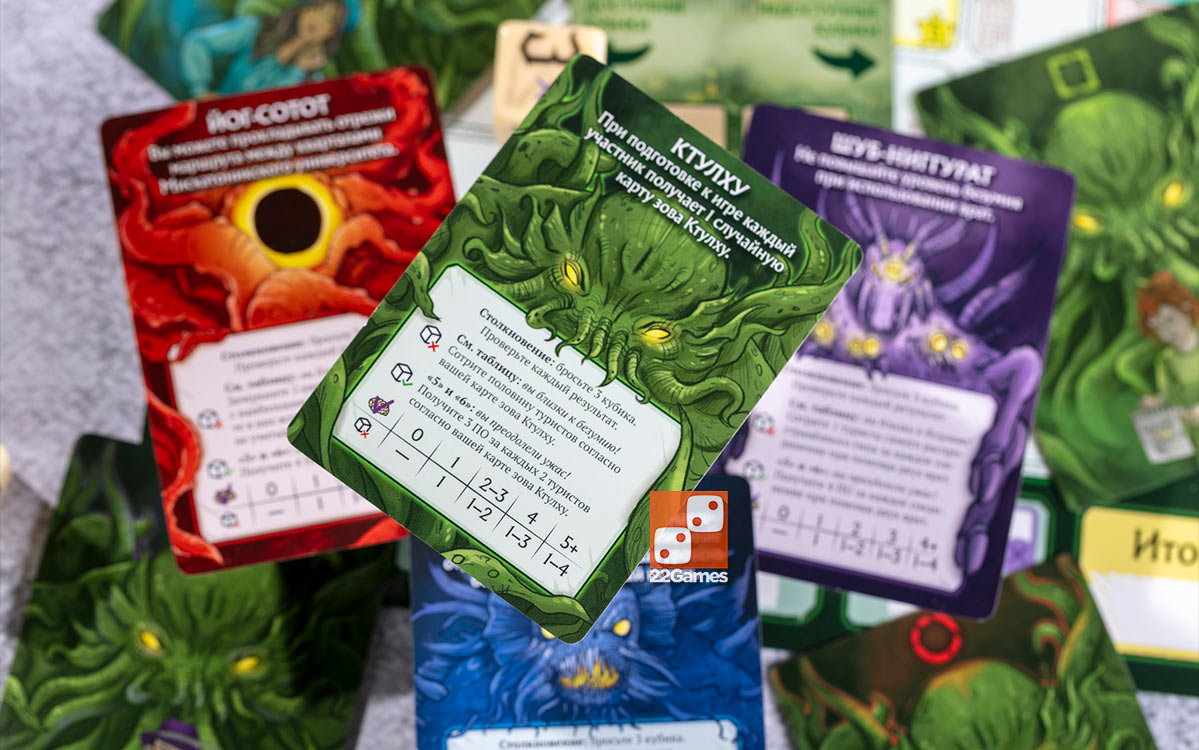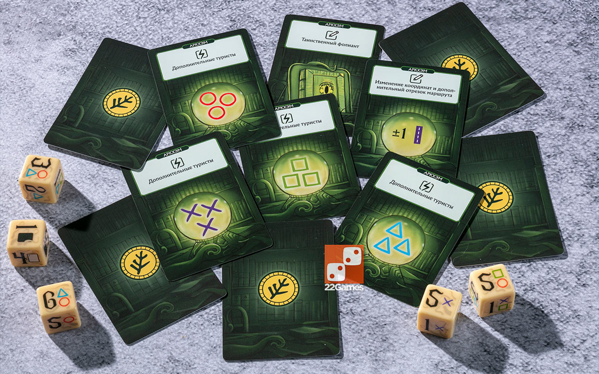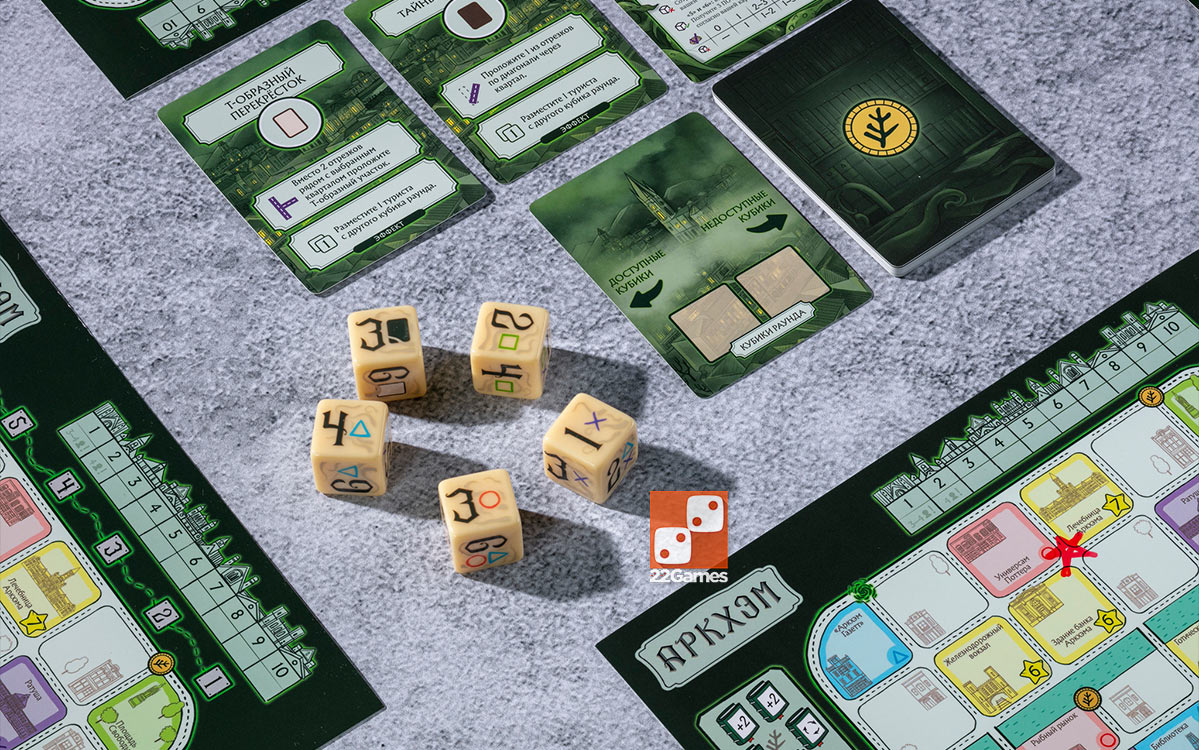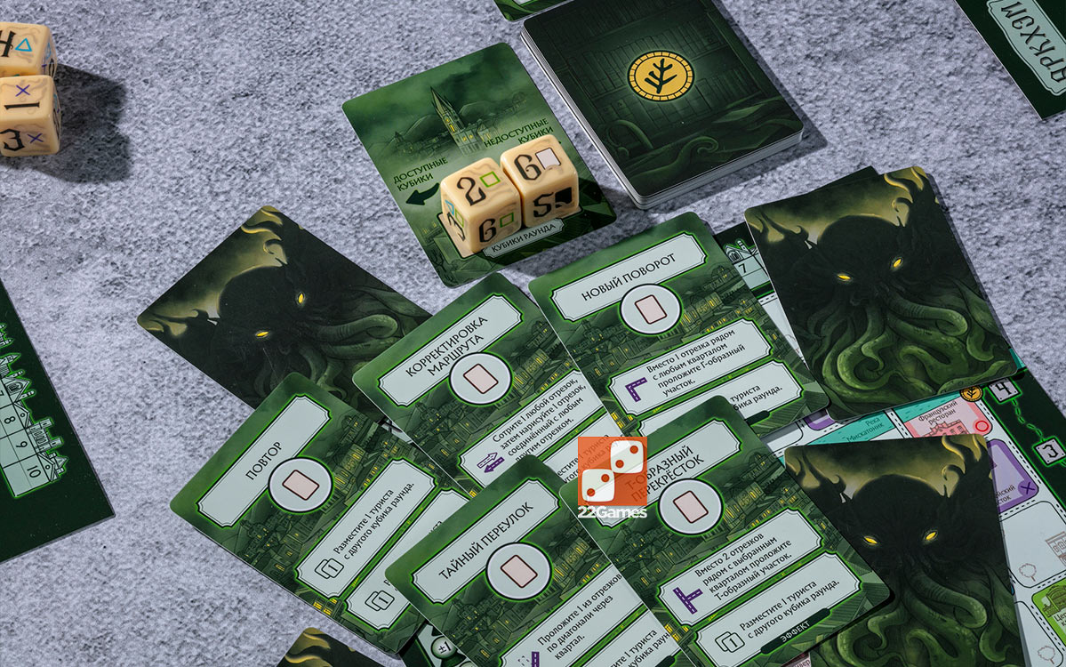 В этой игре для 1–4 участников вы прокладываете экскурсионный маршрут по Аркхэму и при помощи кубиков определяете, каких туристов привлечь на вашу экскурсию. Ваша цель — составить длинный непрерывный путь, соединяющий кварталы, которые интересны разным типам туристов. Перед окончанием партии вы испытаете силы в столкновении с Древним, в котором вы можете получить дополнительные победные очки или потерять часть туристов на вашем маршруте. В конце игры вы получите победные очки только за туристов и кварталы, которые расположены вдоль вашего итогового маршрута. Выигрывает участник, набравший наибольшее количество победных очков (ПО).