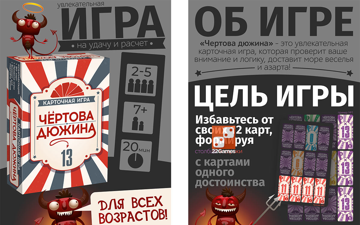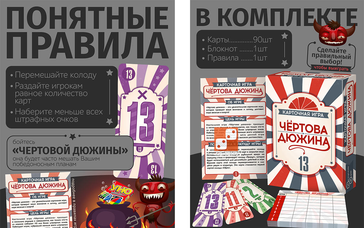 «Чёртова дюжина» —  это карточная игра на удачу и расчёт, состоящая из нескольких раундов, в которой вам предстоит избавляться от своих 12 карт, формируя столбцы и строки с картами одного достоинства.