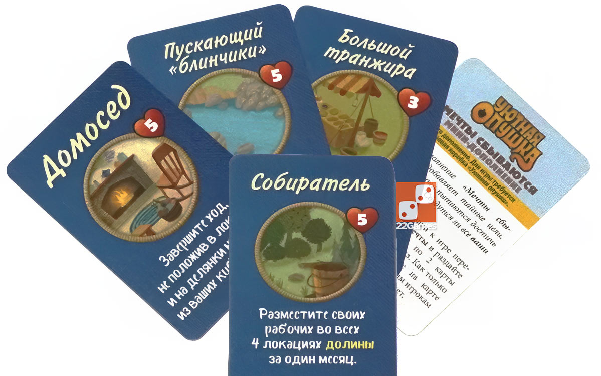 Закончив подготовку к игре по обычным правилам, вы выберете себе по 1 из 5 карт талантов, вышедших на партию. - Мини-дополнение «Мечты сбываются» добавляет тайные цели, которых игроки пытаются достичь в ходе партии. Сбудутся ли все ваши мечты?