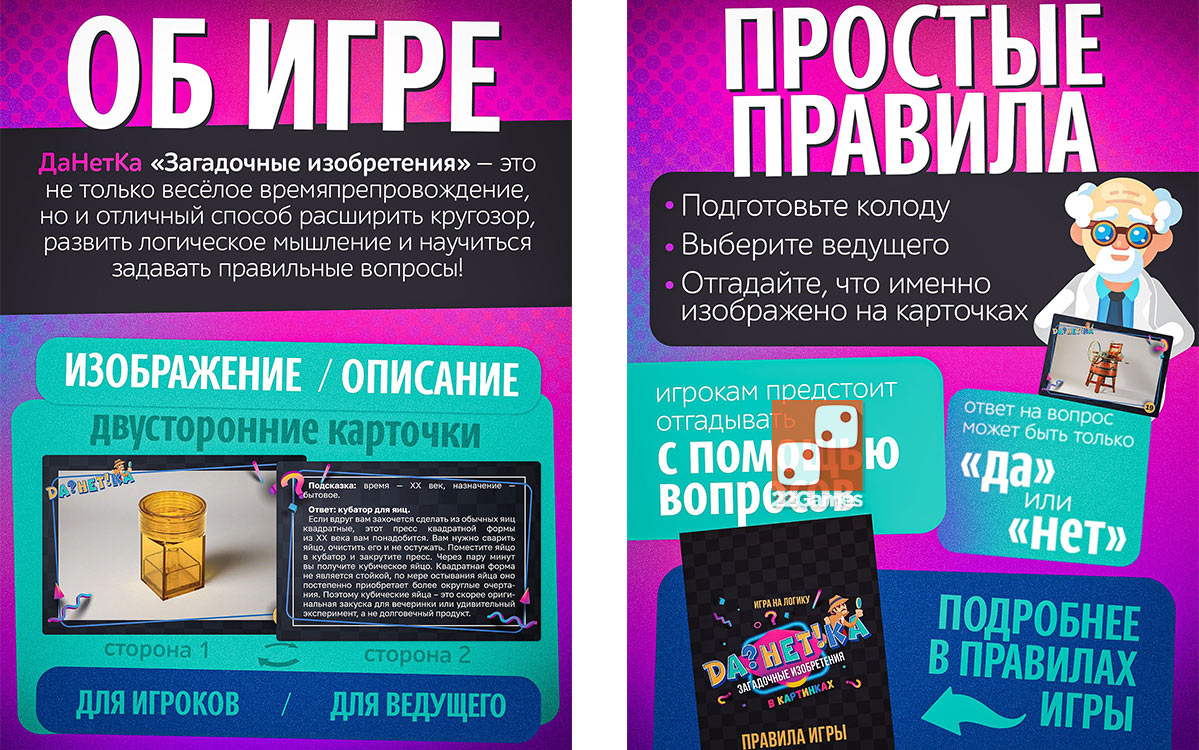 Это увлекательная настольная игра для компании, где игрокам предстоит отгадывать с помощью вопросов, что именно изображено на карточках, и для чего нужны эти необычные изобретения. Ответ на наводящие вопросы может быть только «Да» и «Нет». 75 карт с заданиями.