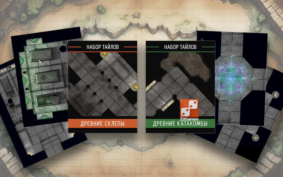 Обратите внимание, стороны «В» некоторых тайлов катакомб не соответствуют сторонам «А». Например, на стороне «В» четырёхстороннего перекрёстка может быть трёхсторонний перекрёсток и наоборот. Или на стороне «В» вертикального прямого коридора может быть горизонтальный прямой коридор. Всего таких тайлов семь. Это нужно, если ведущему понадобится три трёхсторонних перекрёстка вместо двух или больше вертикальных (более длинных) коридоров, чтобы удлинить своё подземелье.