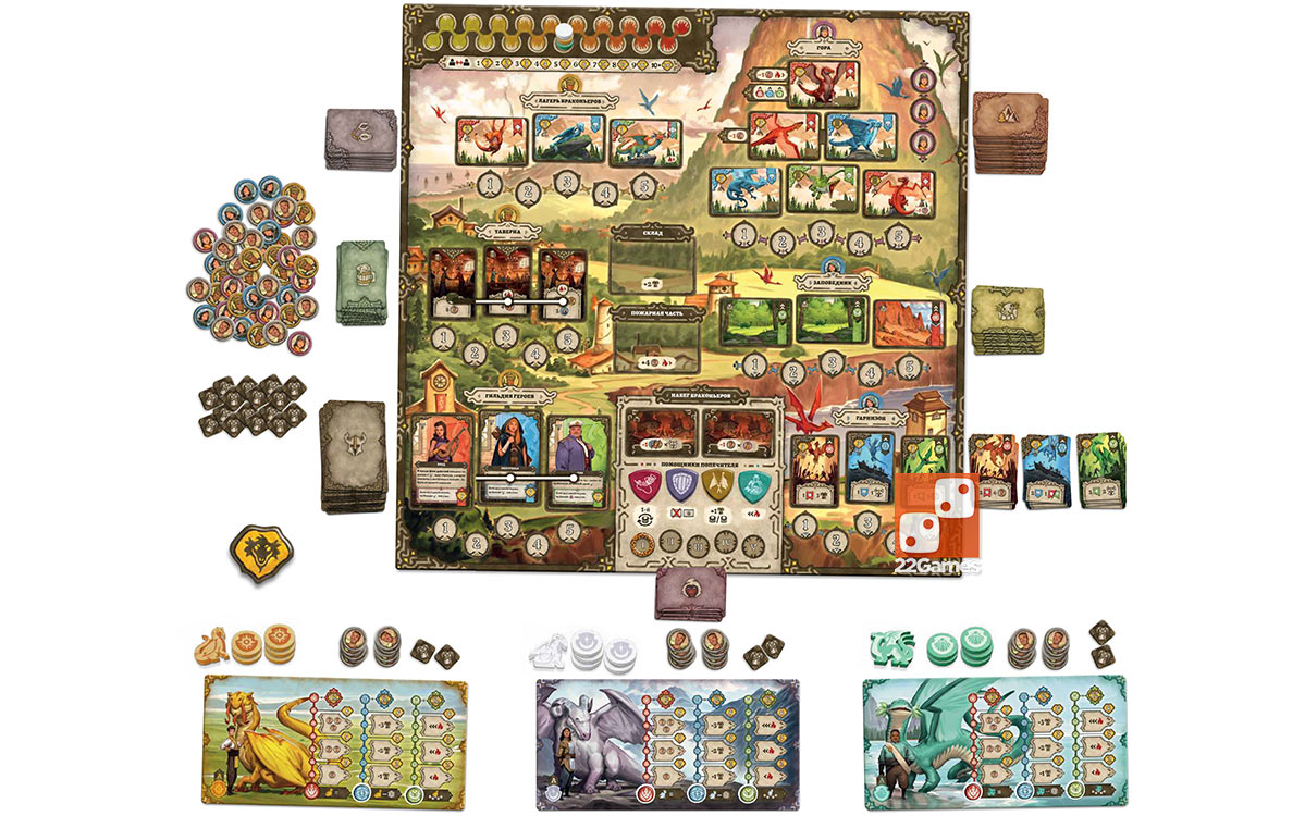 - Выбор действий / action selection: игроки размещают своих работников (hirelings) на локациях, чтобы выполнить разные действия: вербовать героев, спасать драконов, занимать земли и др.