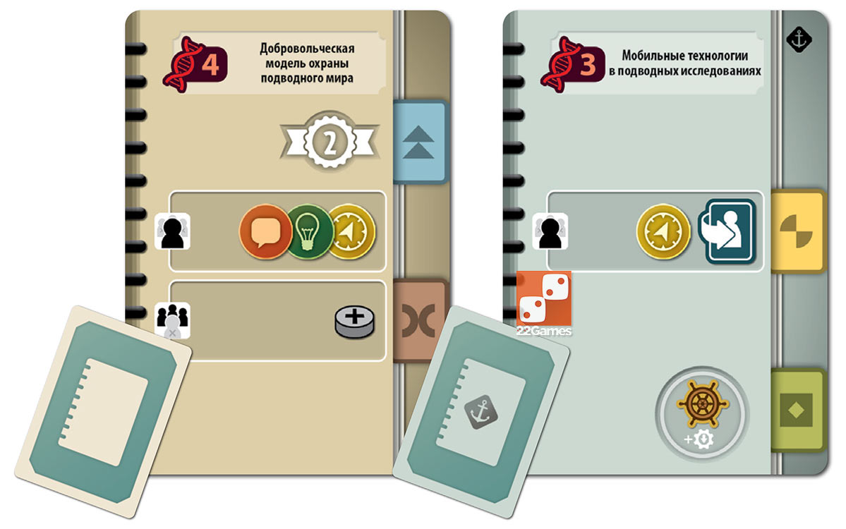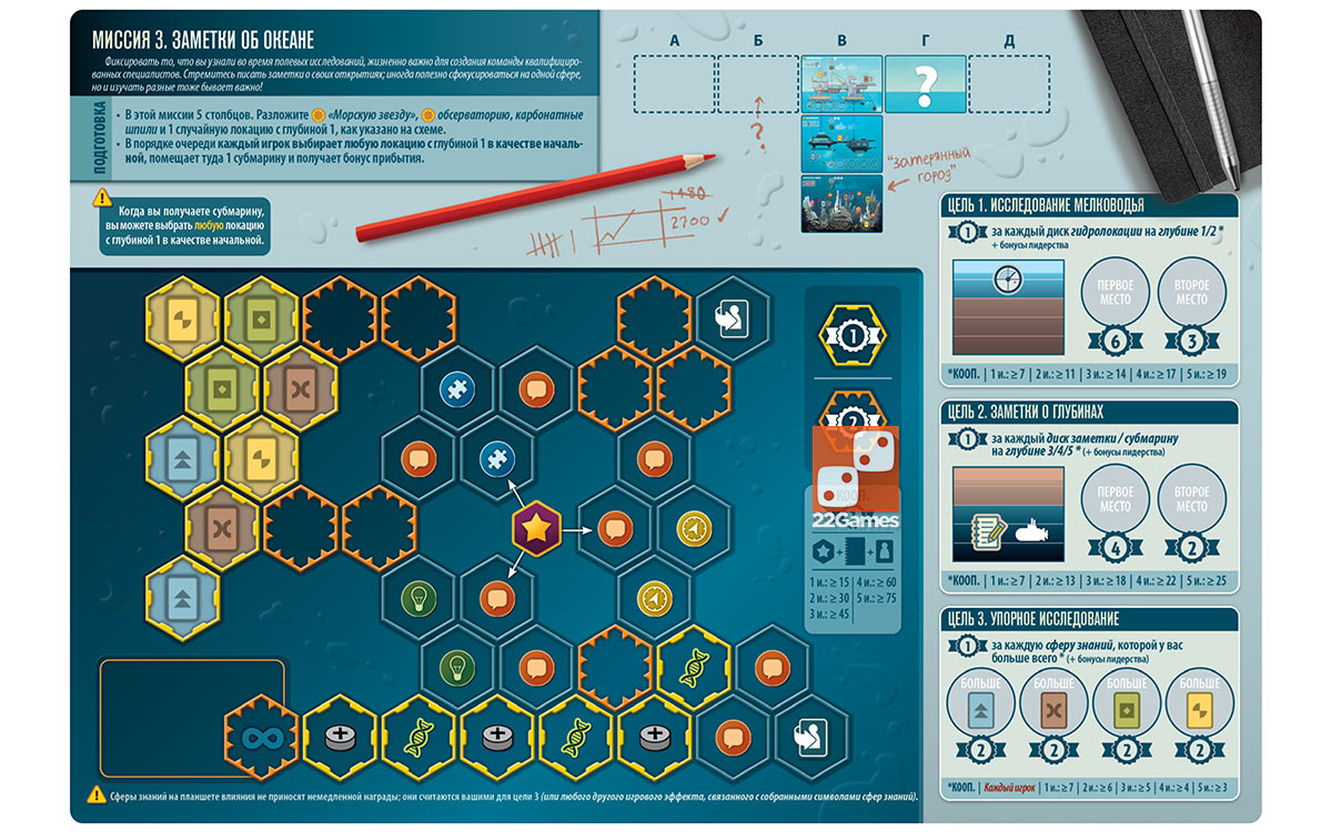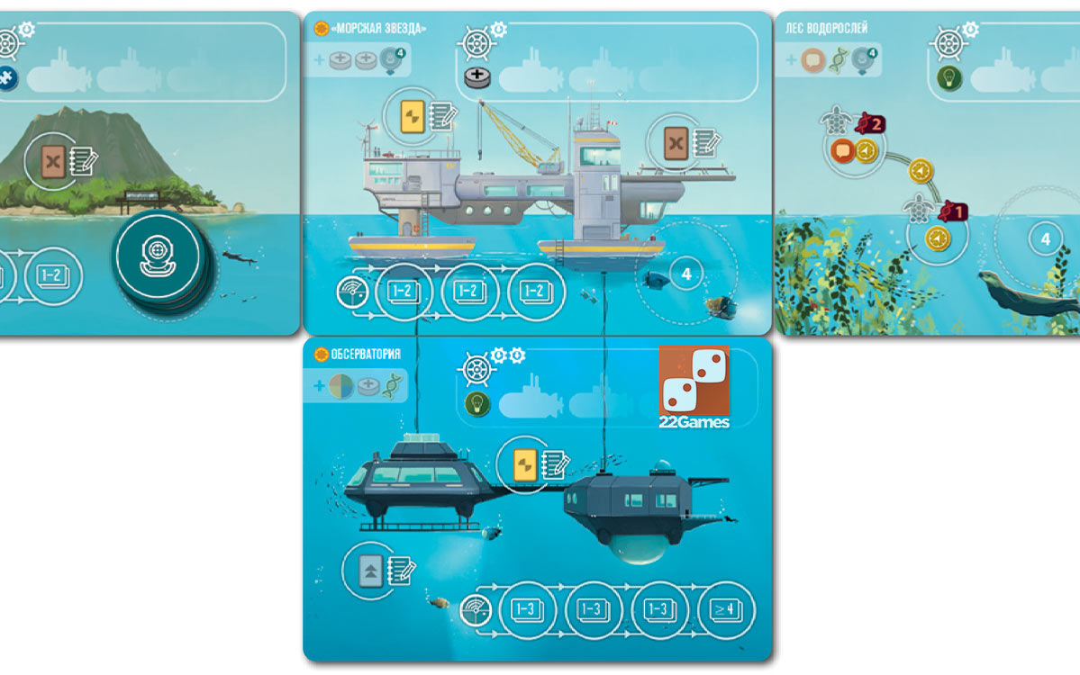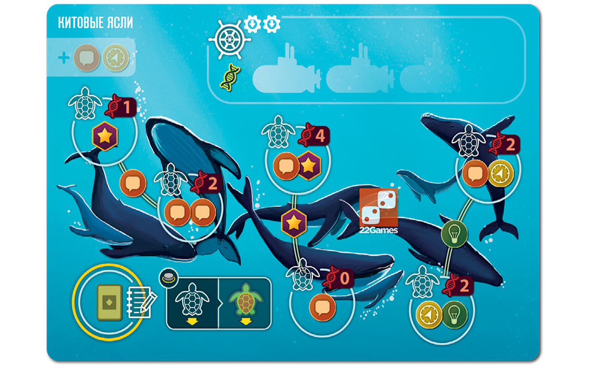 Ход включает две фазы: подготовку и активацию. В первой вы нанимаете специалистов, освобождаете ячейки действий на них и получаете диски действий. Во второй – поочерёдно выполняете действия, создавая эффективные цепочки. Каждое решение важно: перемещение субмарин, использование гидролокации, создание заповедников или написание заметок – все это приводит к новым возможностям для победы и максимизации очков.