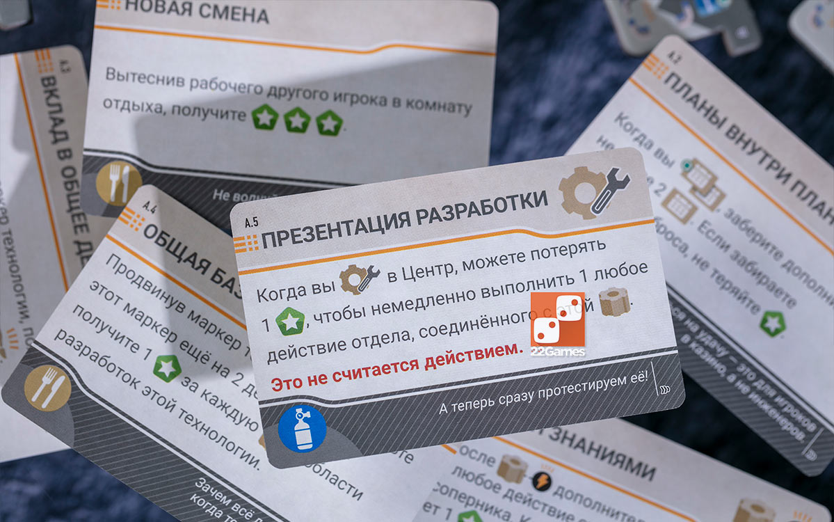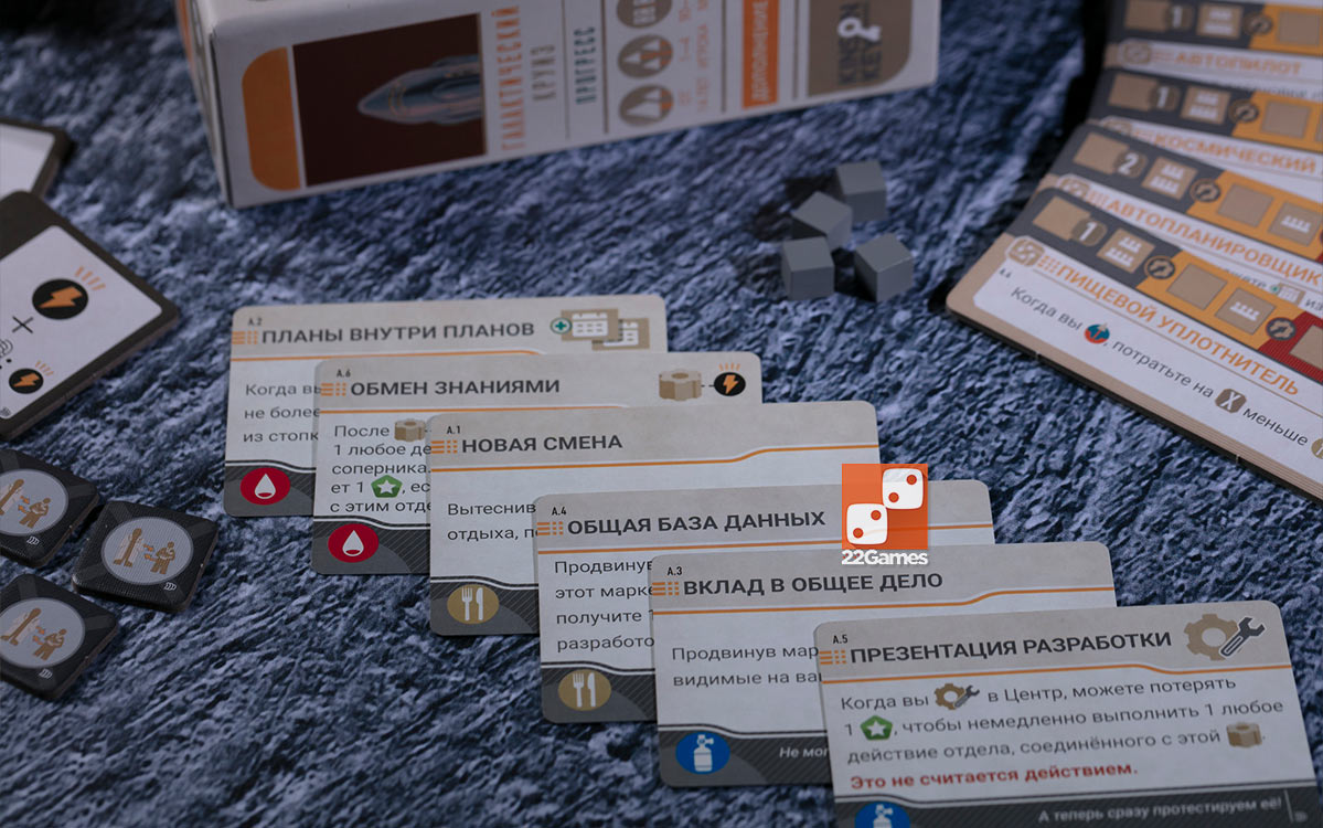 - Модуль «Бонусы отделов» вводит 6 двусторонних жетонов бонусов для отделов Центра. Каждый жетон имеет светло-серую (неактивную) сторону, и как только в отделе появляется третья фишка разработки (или четвёртая при игре вчетвером), жетон переворачивается на тёмно-серую (активную) сторону. Игроки могут получить бонус, разместив рабочего в таком отделе, при этом бонус зависит от количества фишек разработки, соединённых с этим отделом. Исключение составляют бонусы, которые дают 1 карту плана только при соединении с двумя фишками разработки.