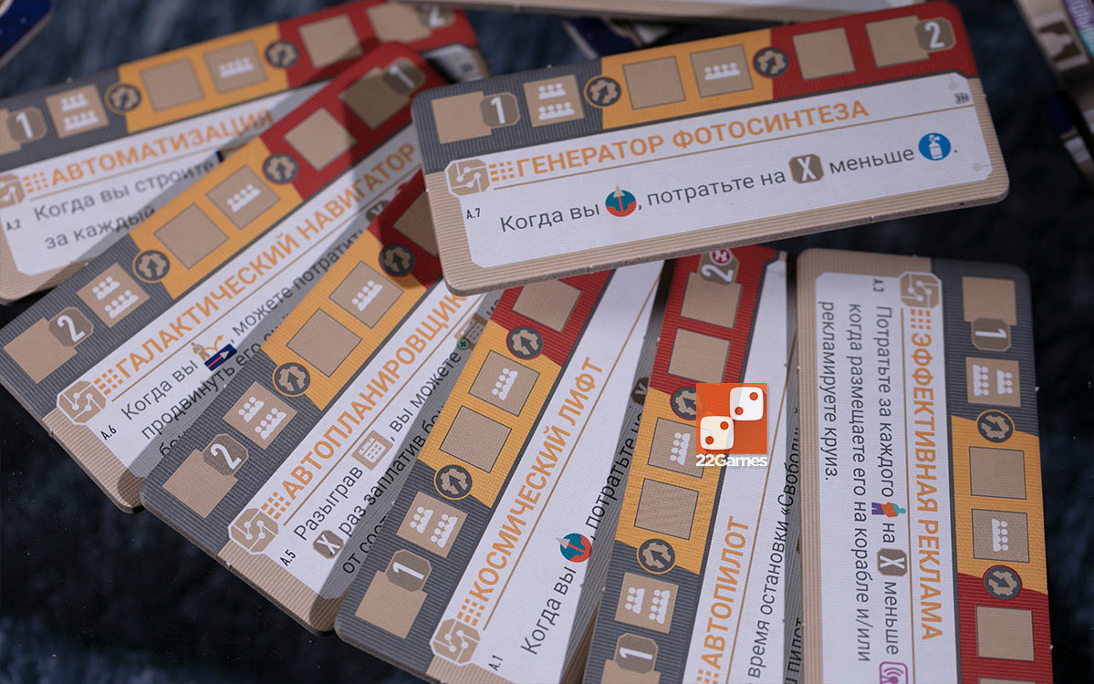 Кроме модулей, в дополнении есть новые карты планов, новые жетоны улучшений, рубки и двигателя, а также специалистов. Карты планов можно замешать в колоду базовой игры, жетоны рубки и двигателя — в соответствующие стопки, а жетоны улучшений позволяют заменить серые жетоны на пусковой башне.