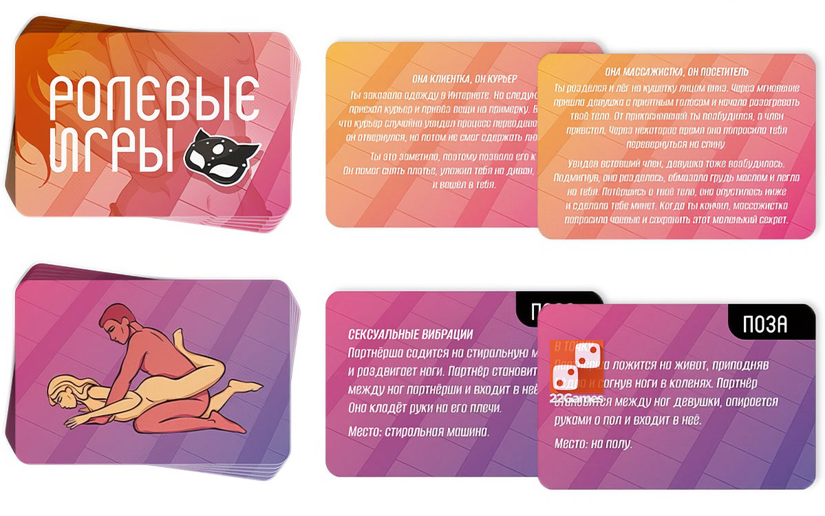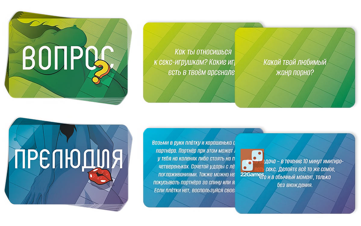 - 60 карт («Ролевые игры», «Прелюдия», «Вопрос», «Позы»),