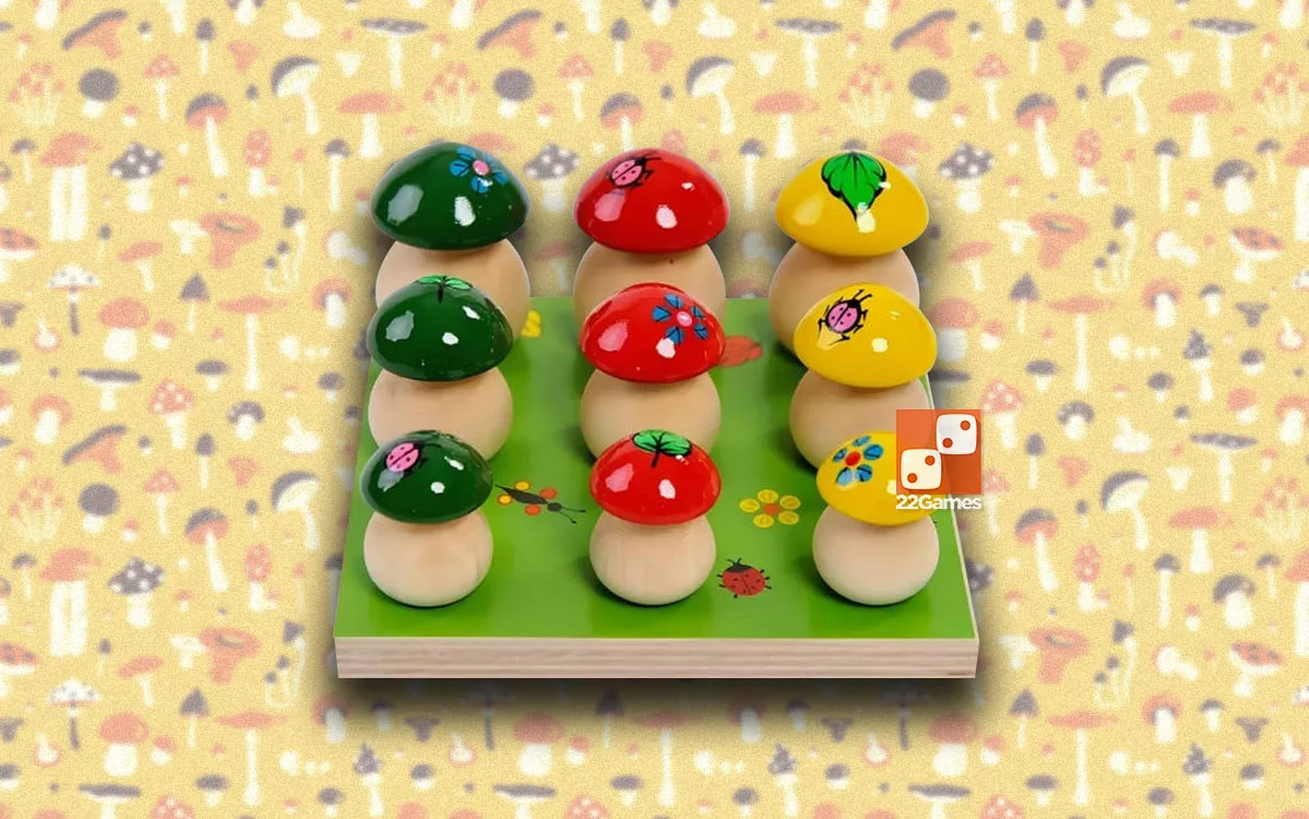 Игровой набор «Грибы на поляне» выполнен в ярких цветах. Он представляет собой деревянное основание со штырьками, на которые насаживаются грибочки. С таким набором можно придумать для ребенка множество увлекательных игр, например предложить ему снимать грибочки с поляны и снова одевать на штыри или рассказать ребенку о цветах, а затем проверять запомнил ли он их.