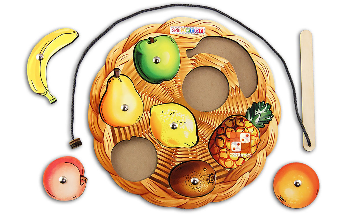 1. Игра «Фруктовая корзина». Рассмотрите корзину с фруктами вместе с ребенком. Назовите, какие фрукты лежат в корзине (банан, яблоко, груша, апельсин, ананас, киви, персик). Попросите найти, например, апельсин. Если фрукт найден верно, предложите достать его из корзины с помощью магнитной удочки. Если ребенок ошибся, фрукт остается на игровом поле. В конце игры посчитайте фруктовый урожай.