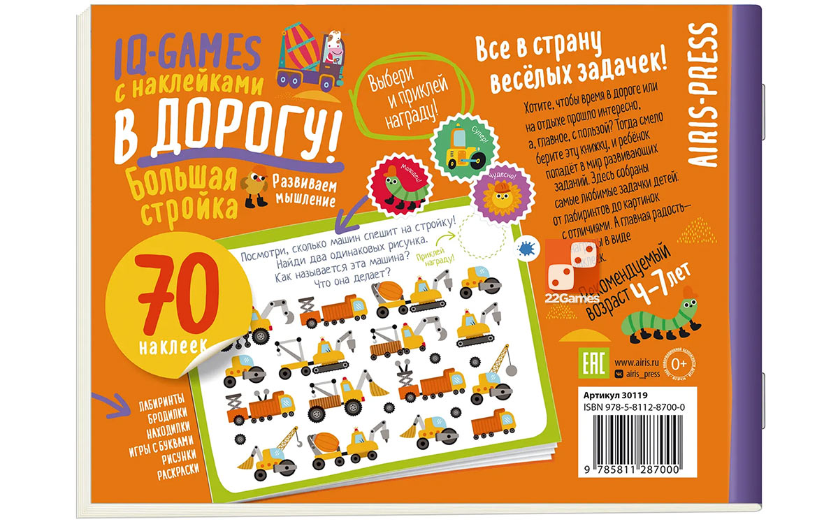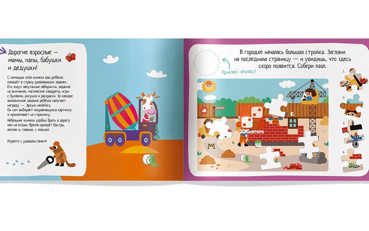 Пособие включает в себя 70 наклеек и весёлые задания для развития мышления. Ребёнка ждут запутанные лабиринты, игры с буквами, картинки с отличиями, пазлы, раскраски.