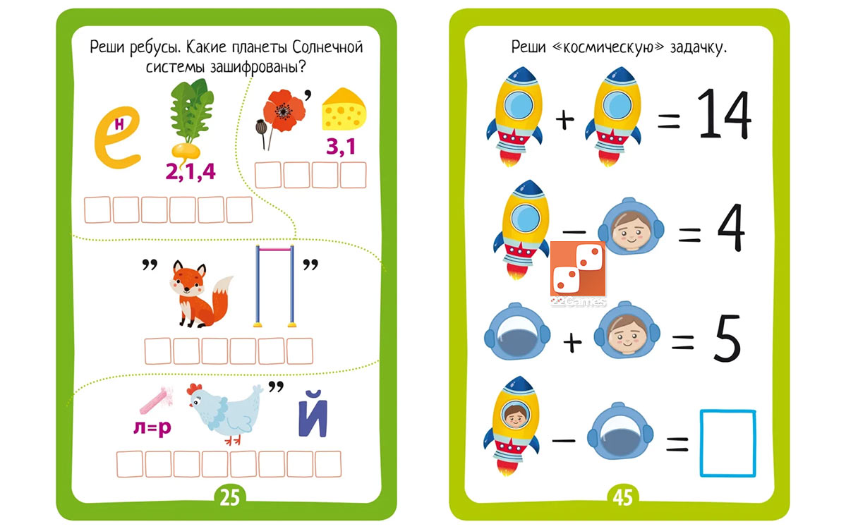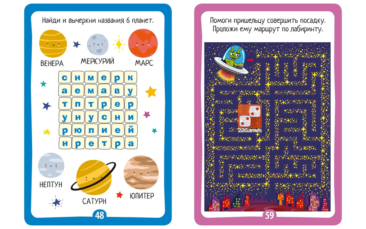 Приключения в космосе начинаются! В этом наборе карточек ребёнок найдёт множество интересных заданий: лабиринты, ребусы и кроссворды, задания на логику, счёт и внимание, шифровки, рисунки по точкам и по клеточкам.