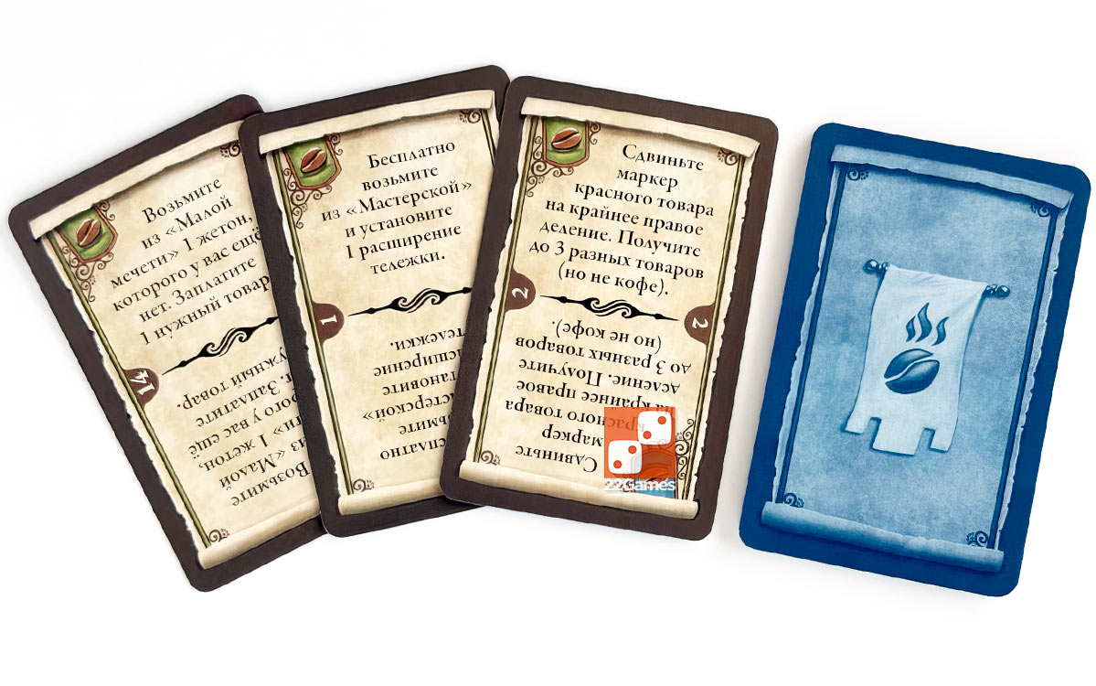 Большая коробка объединяет базовую игру и два расширения («Кофе и Бакшиш» и «Письма и Печати»), сразу давая доступ к полному спектру возможностей.
