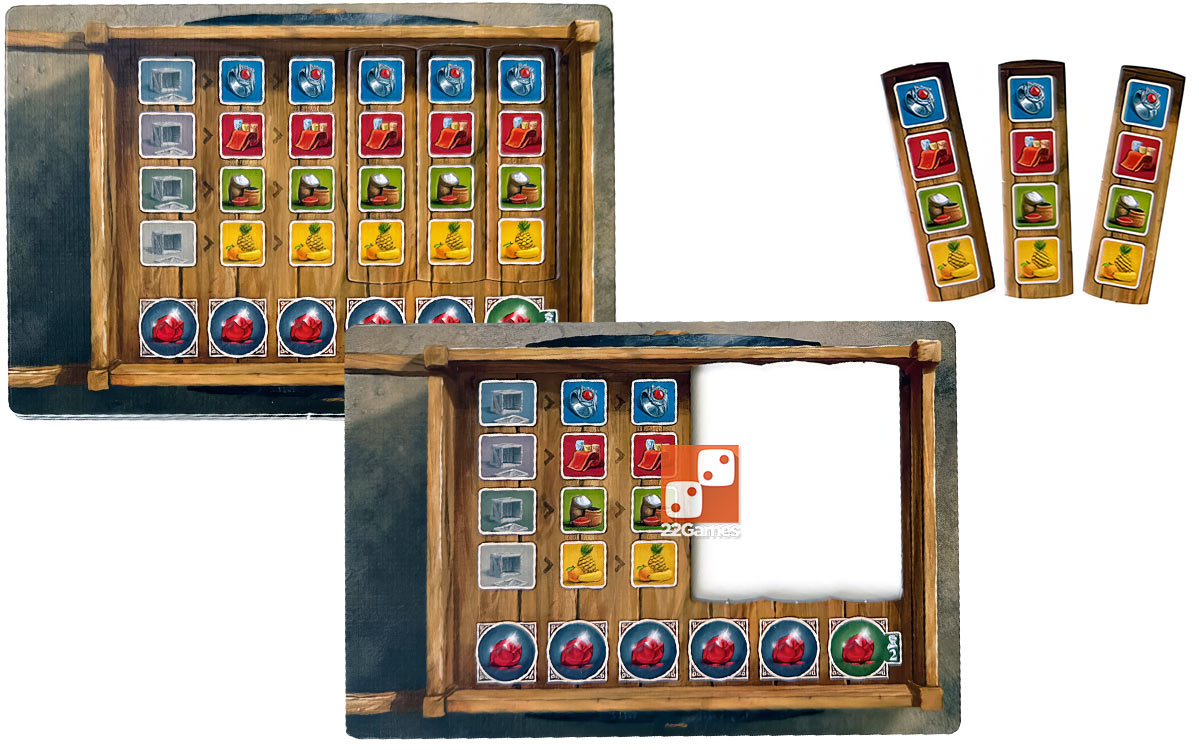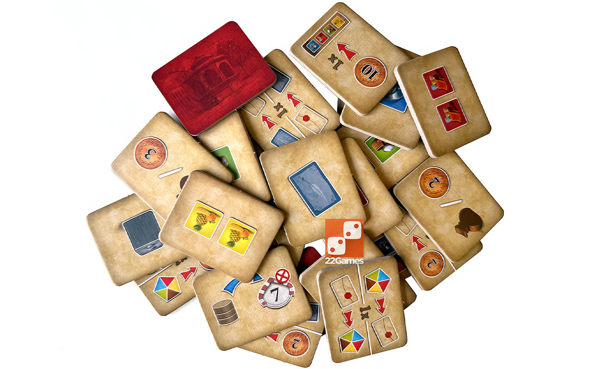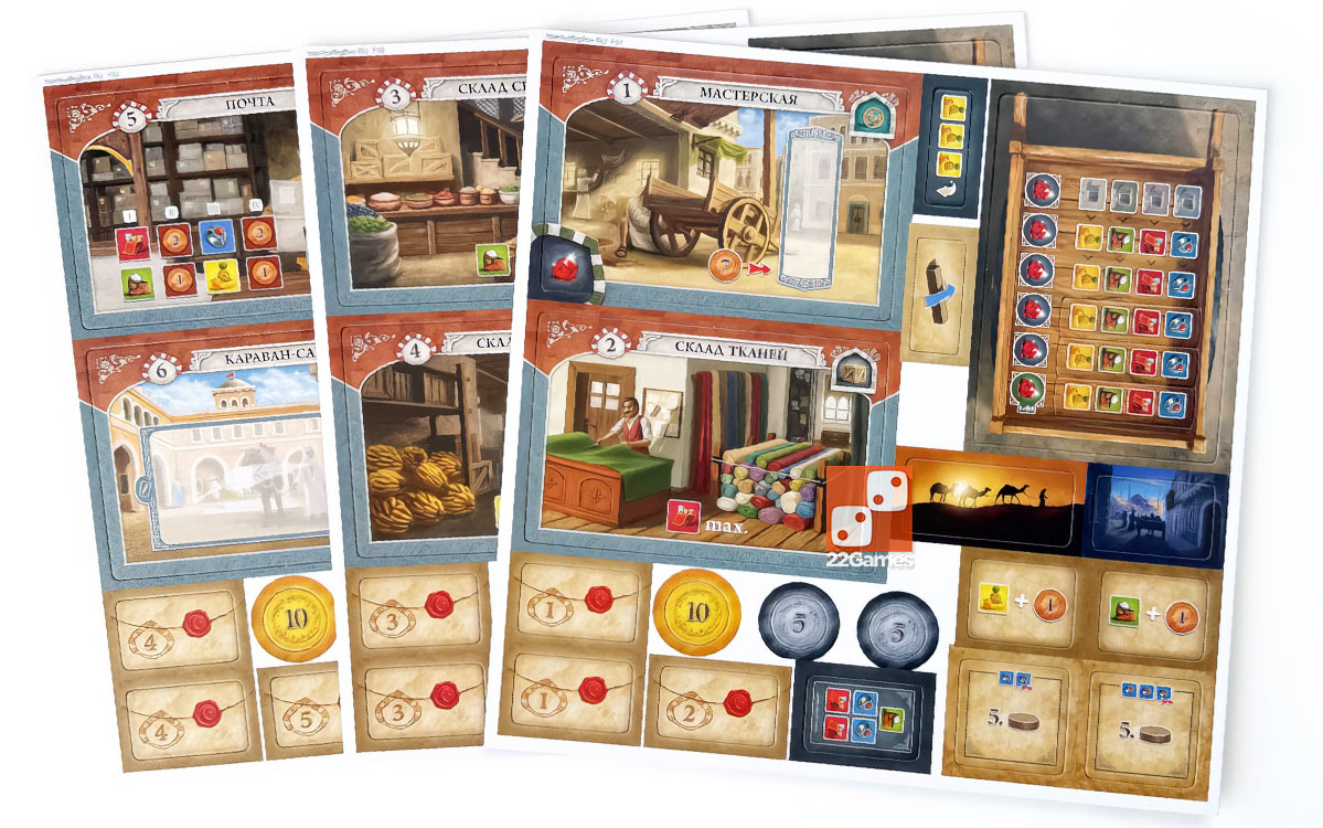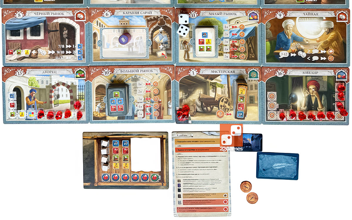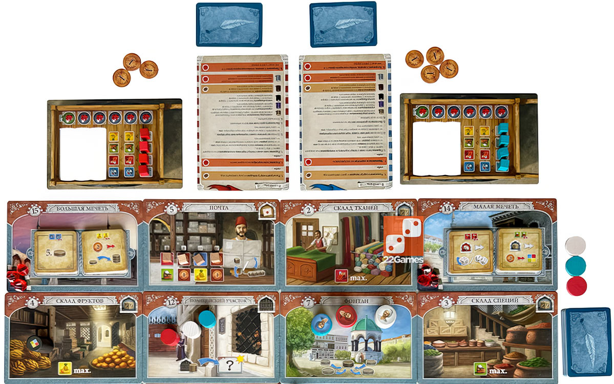 Игровое поле — это модульный рынок из тайлов, который в каждой партии собирается заново. Такой подход делает каждую игру уникальной: одни партии будут динамичными и прямолинейными, другие — стратегическими и осторожными.