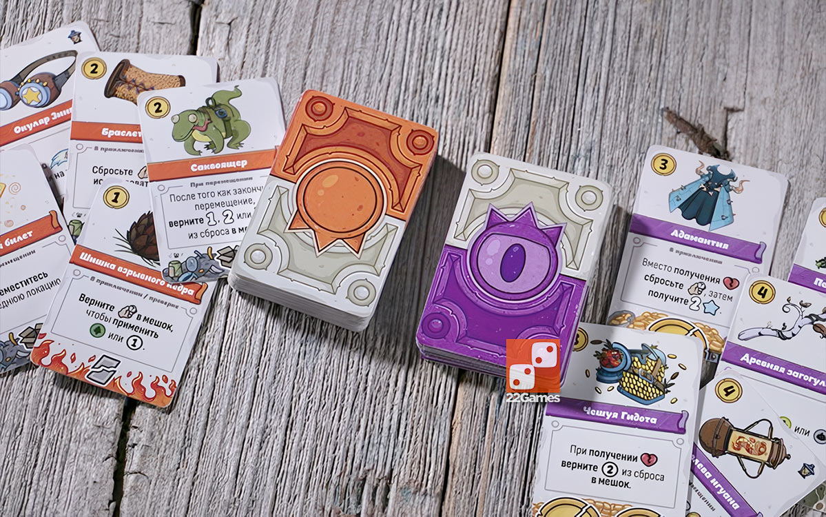 Карты обычных и заизнаненных предметов прекрасно раскрывают потенциал вашего мешка, позволяя слабым жетонам заиграть новыми красками, а вам выстраивать множество альтернативных стратегий по прохождению проверок и приключений.