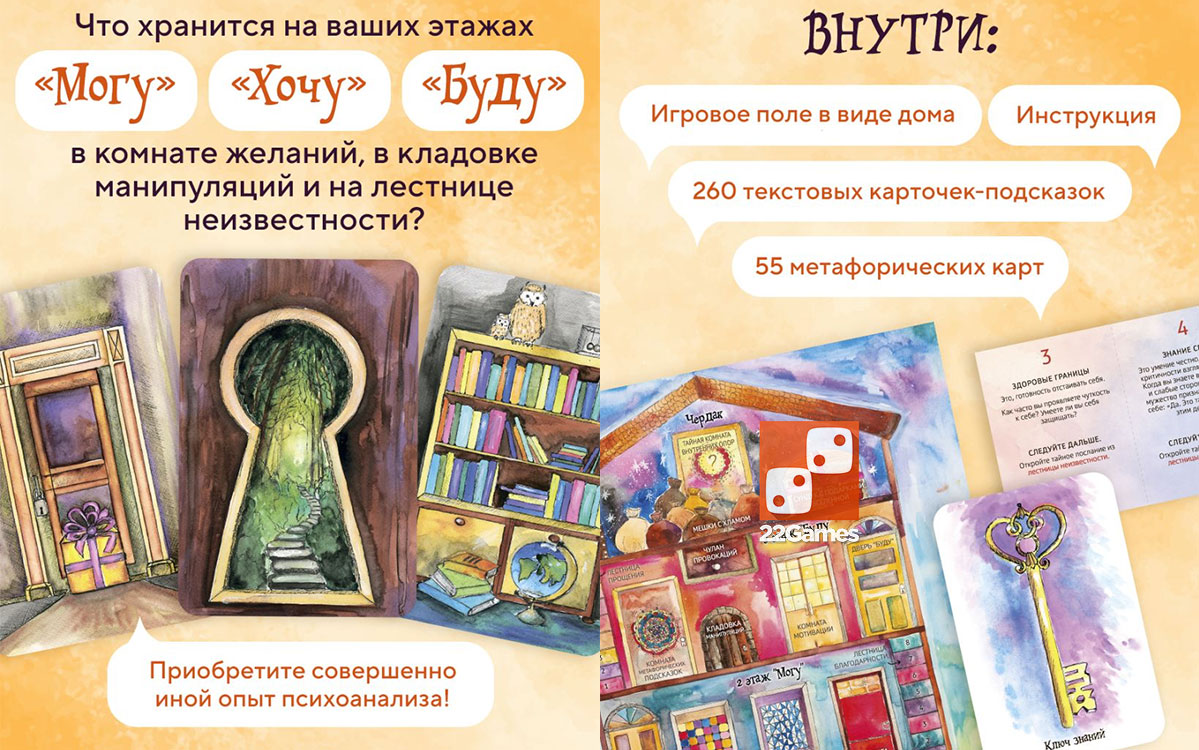 - 260 текстовых карточек-подсказок и 55 метафорических карт,