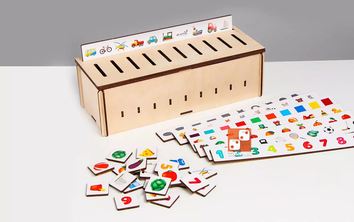- Начинайте с более легких тем, таких как транспорт, игрушки или фрукты/овощи. Пусть ребенок найдет идентичную рисунку на линейке фишку и опустит ее в прорезь.