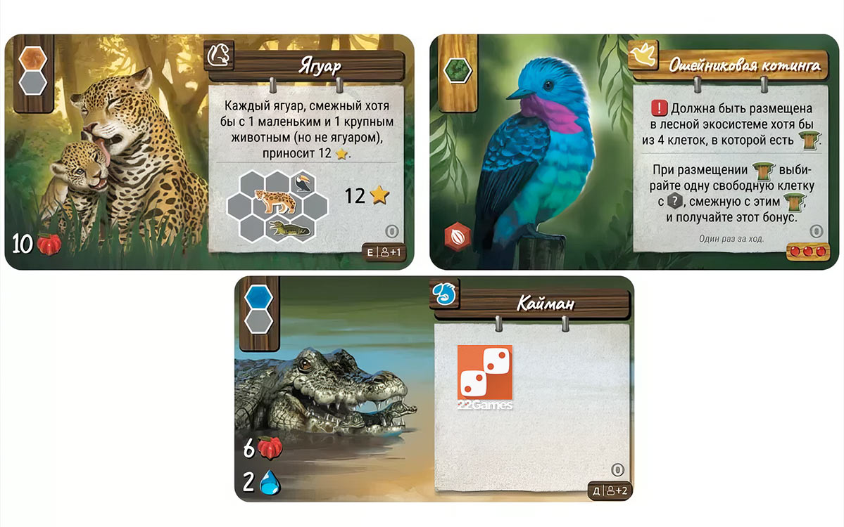 «Новые обитатели» — дополнение к игре Дикая природа Амазонии, которое добавляет свежие карты животных и меняет привычные правила подсчёта очков.