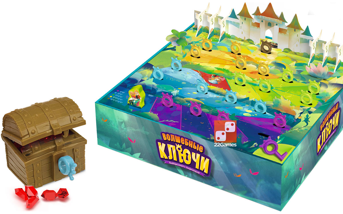 Эта игра развивает мелкую моторику, навыки счёта и принятия решений. Но в первую очередь она дарит удовольствие детям любого возраста. «Волшебные Ключи» легко увлекут и самых маленьких игроков, и даже взрослых! Международные настольные премии не зря отметили красочное оформление, азартный игровой процесс и восхитительные компоненты. Только посмотрите на эти яркие пластиковые ключи и кубики, сверкающие кристаллы в закрывающемся сундуке, объёмное поле и деревянную фигурку. Даже подготовка к партии превращается в увлекательное строительство королевского дворца из плотного картона. Разноцветные ключи так и хочется брать в руки, а при попытке открыть вожделенный сундук — задержать дыхание в радостном ожидании… Ура, открылся!