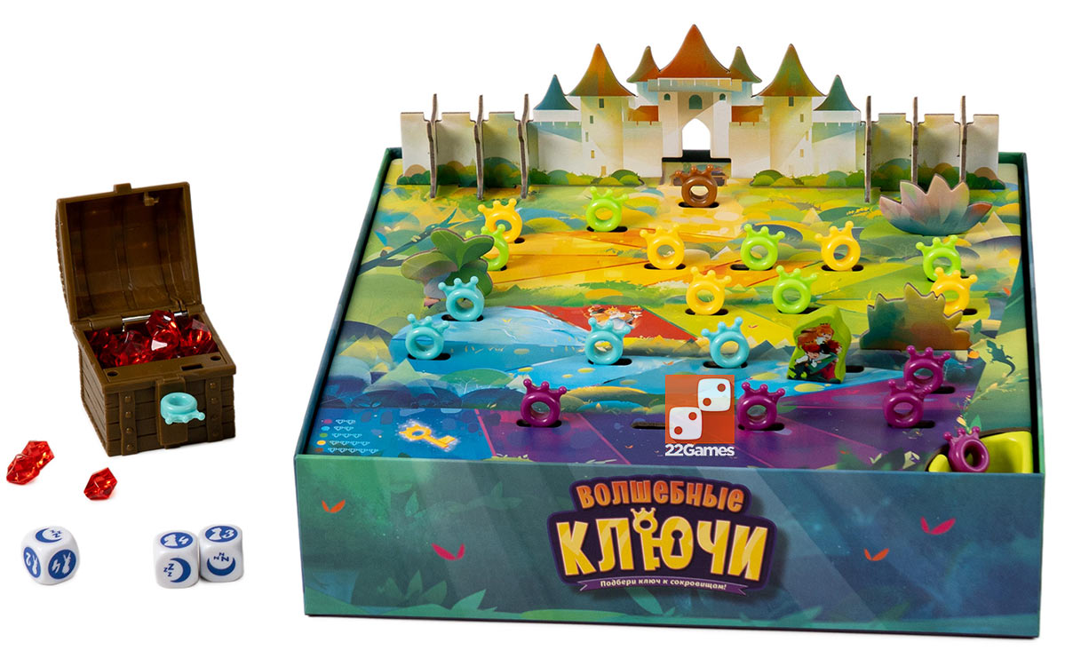 На первый взгляд, Волшебные Ключи — это игра-бродилка, в которой вы бросаете кубики и движетесь к цели наперегонки с соперниками. Но здесь творится какая-то настольная магия! Вы сами выбираете нужный кубик, можете отдохнуть на Опушке чудес и решаете, стоит ли продолжать свой путь к золотому ключу.