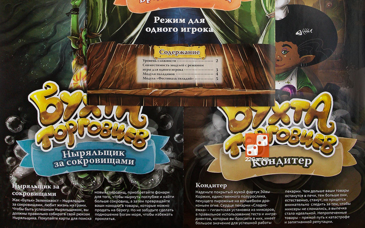 В дополнение к новым торговцам в этой коробке вы найдете Фестиваль гильдий, который еще больше разнообразит ваши игры. Новая часть игрового поля присоединяется снизу к уже имеющейся. На ней новые шкалы для каждой гильдии и новые возможности взаимодействия с ними. Волшебники могут зачаровать ваши товары, чтобы они стали дороже, а разбойники помогут вам подставить других игроков и перекинуть на них свою порчу. И это еще не все, что вы сможете найти в модулях этого дополнения! Вас ждут новые горожане, паладины и многое другое!