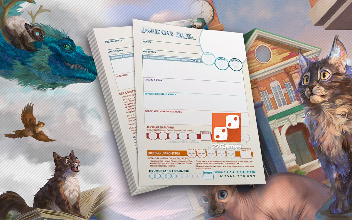 В настольной ролевой игре «Волшебные котята спешат на помощь!» вы станете волшебными котятами, спасающими своих хозяев и свой город от всяческих проблем. А проблемы бывают ой какие разные! От школьных неурядиц и барабашек в шкафу до страшной лесной ведьмы, похищающей городских детей, и сверхразумных енотов, пытающихся поработить весь мир при помощи собранных из мусора гаджетов!