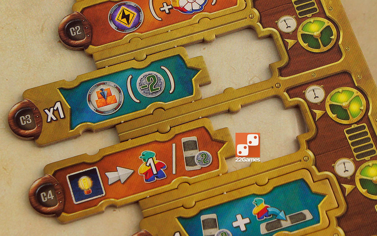 В своей партии вы последовательно размещаете тайлы действий на верхней части личного планшета, выполняя два связанных действия. Всего доступно пять основных типов действий: урбанизация, индустриализация, строительство дорог, выполнение контрактов и снабжение зданий энергией. С развитием вы открываете новые тайлы с улучшенными эффектами и приобретаемые технологии.