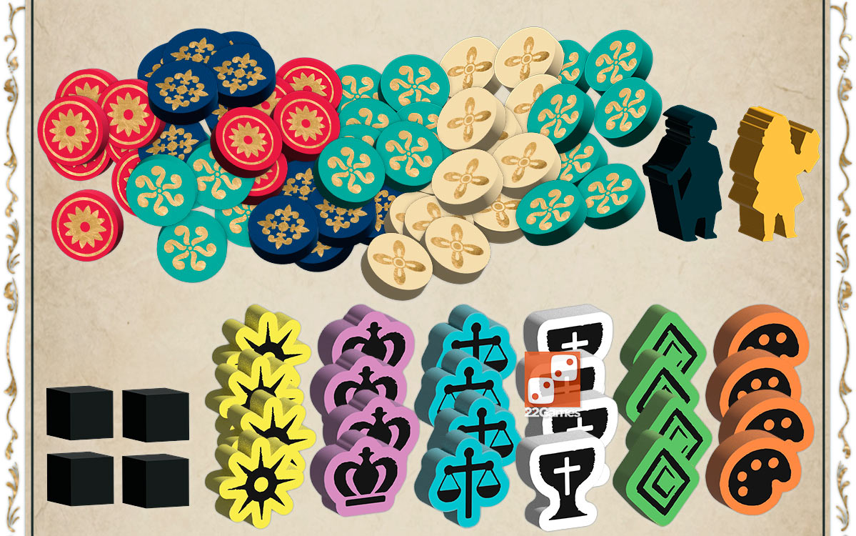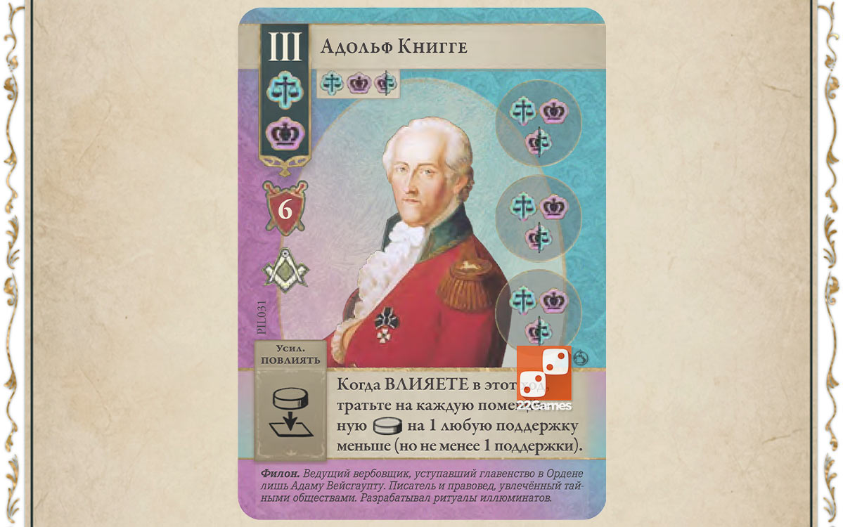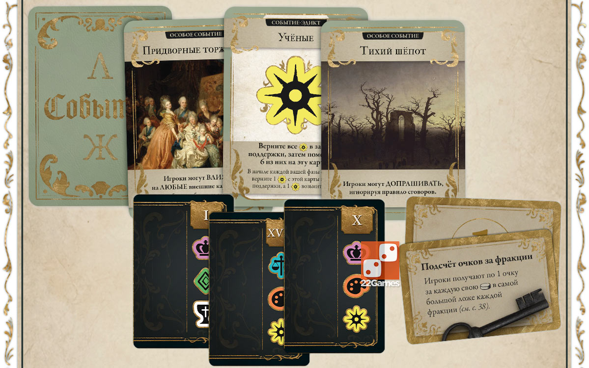 Важнейшим ресурсом в игре является поддержка фракций: с помощью жетонов поддержки вы сможете совершать большинство доступных действий. Также немаловажно сконцентрироваться на распространении влияния – размещении своих жетонов в соответствующие ячейки на картах просвещённых. Именно благодаря влиянию вы получаете доступ к манипуляциям с картами и обладаете преимуществами в решении спорных ситуаций. Зачастую для выполнения карт замыслов вам нужно будет распространять своё влияние на ложи – последовательности из трёх и более соседних карт просвещённых, принадлежащим хотя бы к одной общей фракции. Сами же просвещённые имеют степень посвящения в дела Ордена – от начальной до великого магистра (и королевской арки). Этот параметр поможет вам при плетении заговоров и в спорах с соперниками.