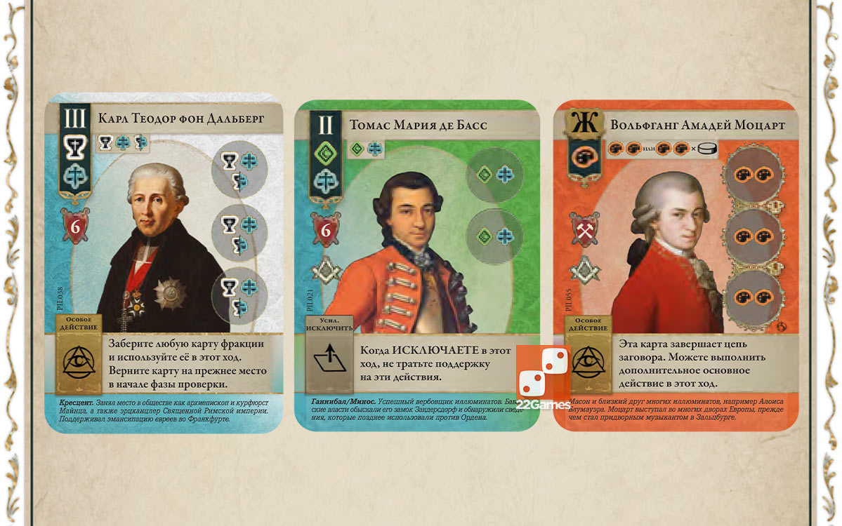 Вы возьмёте на себя роль высокопоставленного ученика Адама Вейсгаупта – основателя тайного общества иллюминатов, стремящегося воплотить в жизнь революционные идеи своего времени. Устраивайте заговоры, вербуйте новых сторонников и расширяйте влияние ордена! Тот, кто реализует замыслы Вейсгаупта раньше всех, и победит в игре.
