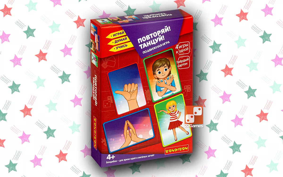 «Повторяй! Танцуй!» из серии «Играй Думай Учись» от Bondibon – это подвижная игра авторской разработки, включающая в себя различные варианты игры. Игра предназначена для детей от 4-х лет, но весёлый игровой процесс увлекает и ребят постарше, и даже взрослых.