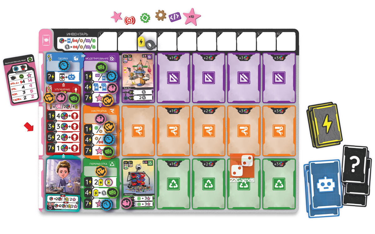 В каждом раунде игроки будут разыгрывать по 2 карты действий, которые будут усилены 2 картами энергии. Выбор одного игрока может повлиять на то, сколько действий за раунд смогут выполнить его соперники. Ведь используя кубики энергии, игрок даёт возможность выполнить это действие соперникам, даже если они разыграли другие карты. В конце игры победит тот, кто приобретёт наилучшую репутацию и заработает больше всего победных очков (ПО).