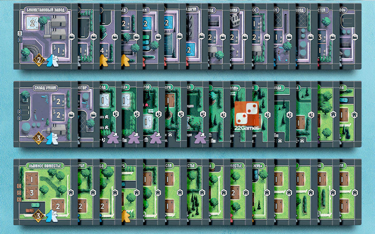 - 90 фигурок работников (16 бесцветных, 8 тёмно-серых, 13 синих, 11 фиолетовых, 11 жёлтых, 8 коричневых, 8 зелёных, 8 малиновых, 7 розовых),