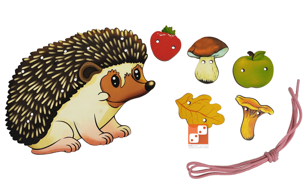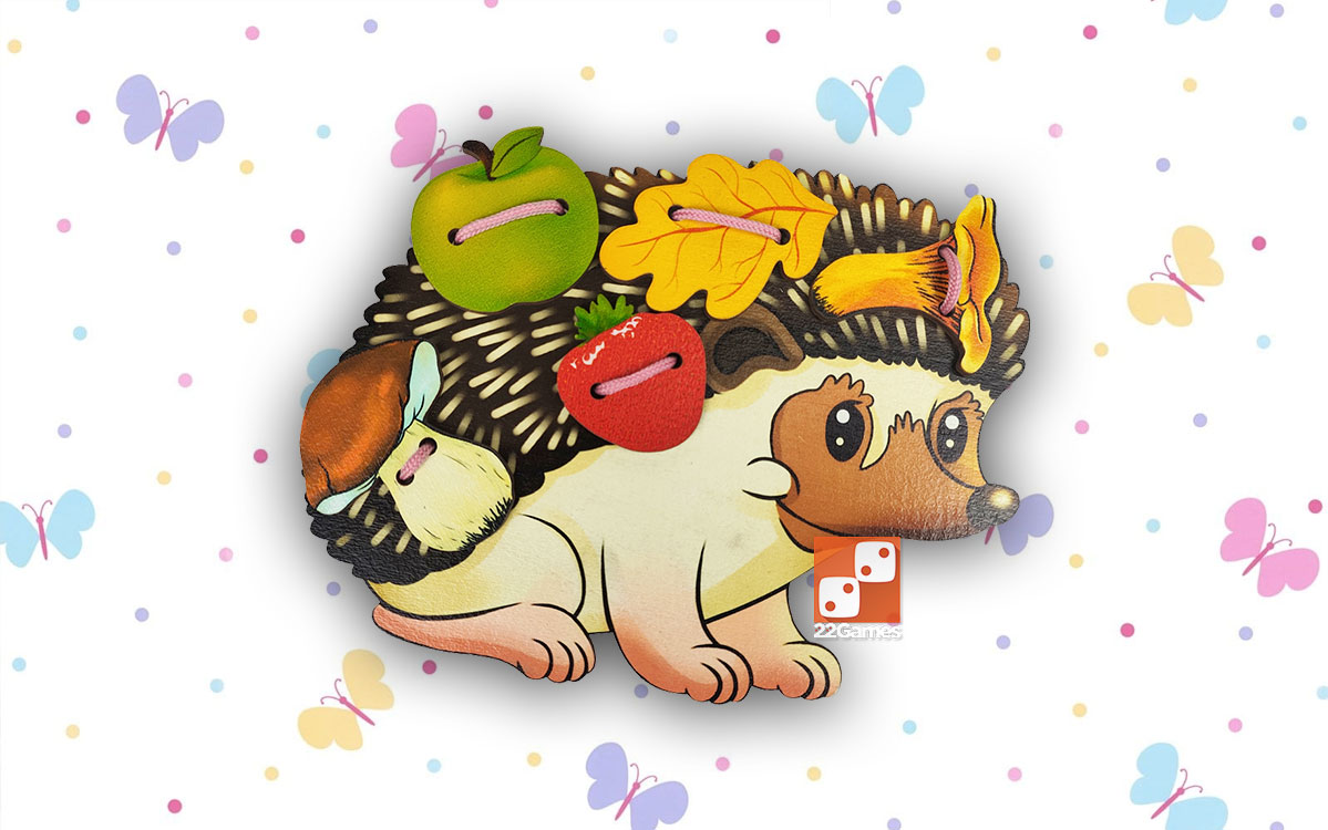 Деревянная шнуровка выполнена в виде забавного ежика, несущего к себе в норку листочек, грибочек и яблоко на своих иголках. Эта игрушка может стать отличным инструментом для развития мелкой моторики ребенка, а также тренировки памяти и сообразительности в ненавязчивой игровой форме. Игрушка сделана из качественного дерева и окрашена экологически чистыми красками.