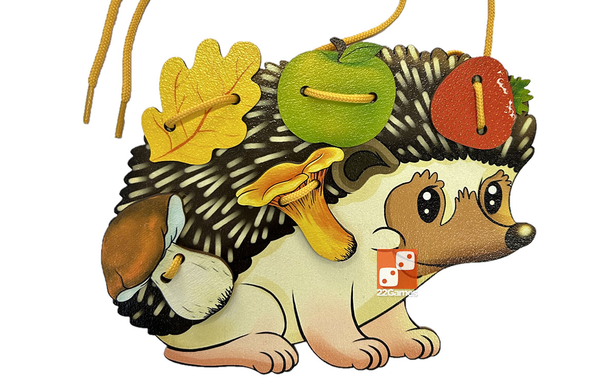 Ребенку предстоит при помощи шнурочка «пришить» к большому веселому ежику 3 элемента – яблоко, грибок и листик.