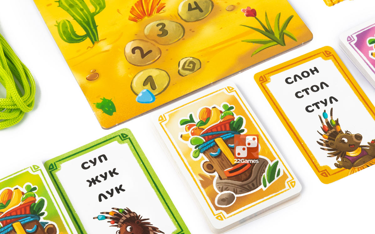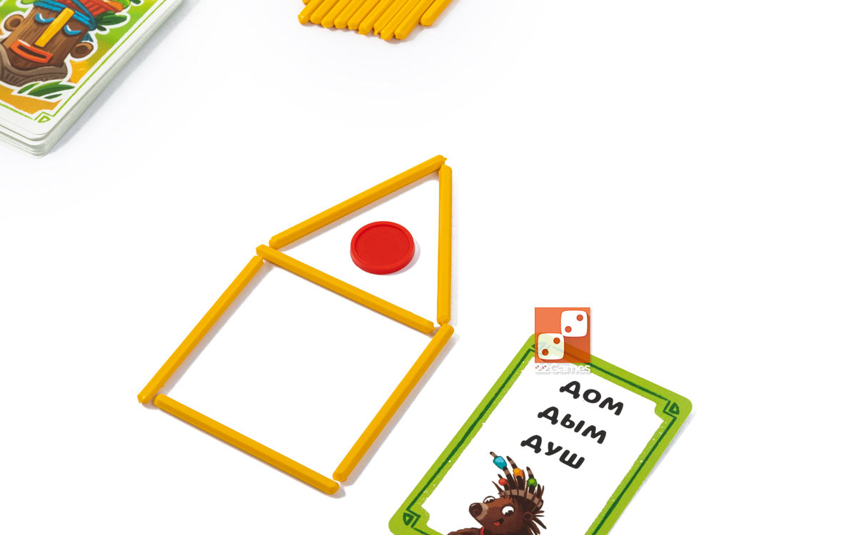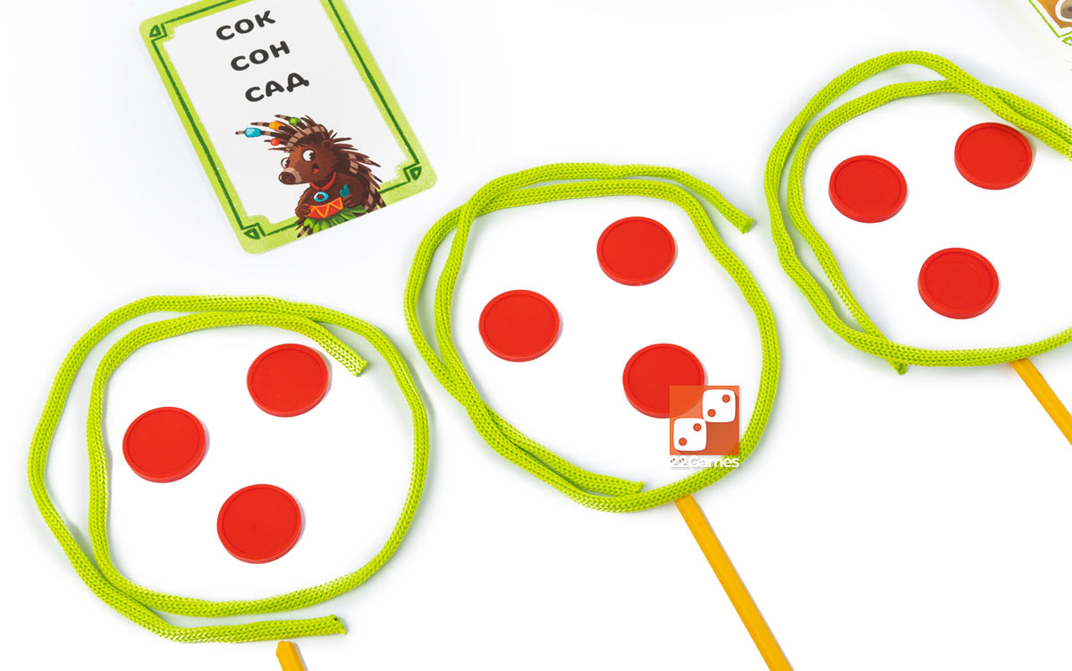 На каждой карточке с заданием написано по 3 слова, длина и сложность которого зависят от уровня карточки). Используя диски, палочки и шнурочки, игрок составляет картинку, изображающую одно из слов на его карточке. Другие игроки в свою очередь должны угадать, какому из слов соответствует картинка. Так каждому участнику нужно будет прочитать слова как на своей карточке, так и на карточках соперников — отличная практика в игровой форме.