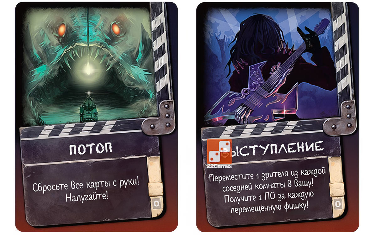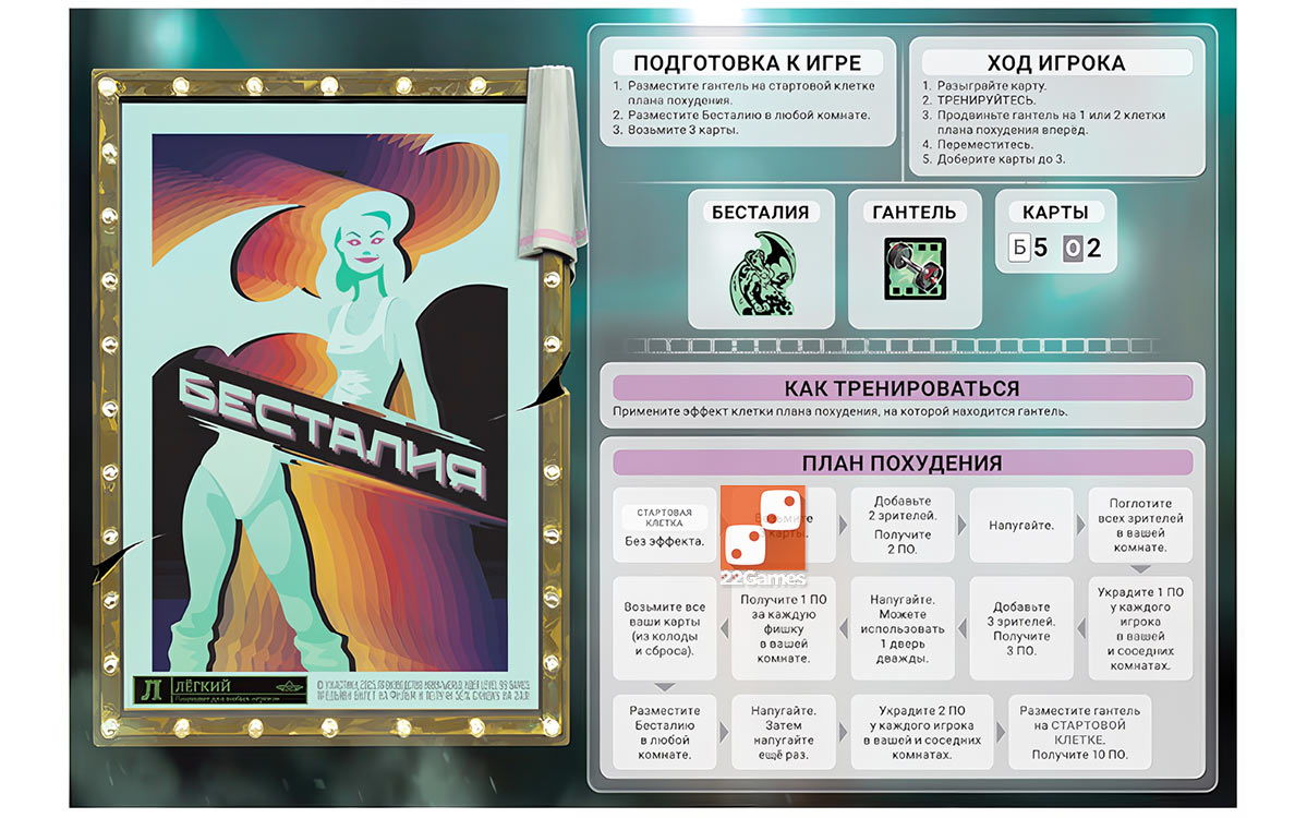 Выберите одного из двадцати монстров и получите его персональный планшет с особыми способностями. Ваша главная задача – сеять панику среди зрителей, накапливая победные очки (ПО) через запугивание и хитрые комбинации. Каждый ход вы будете: