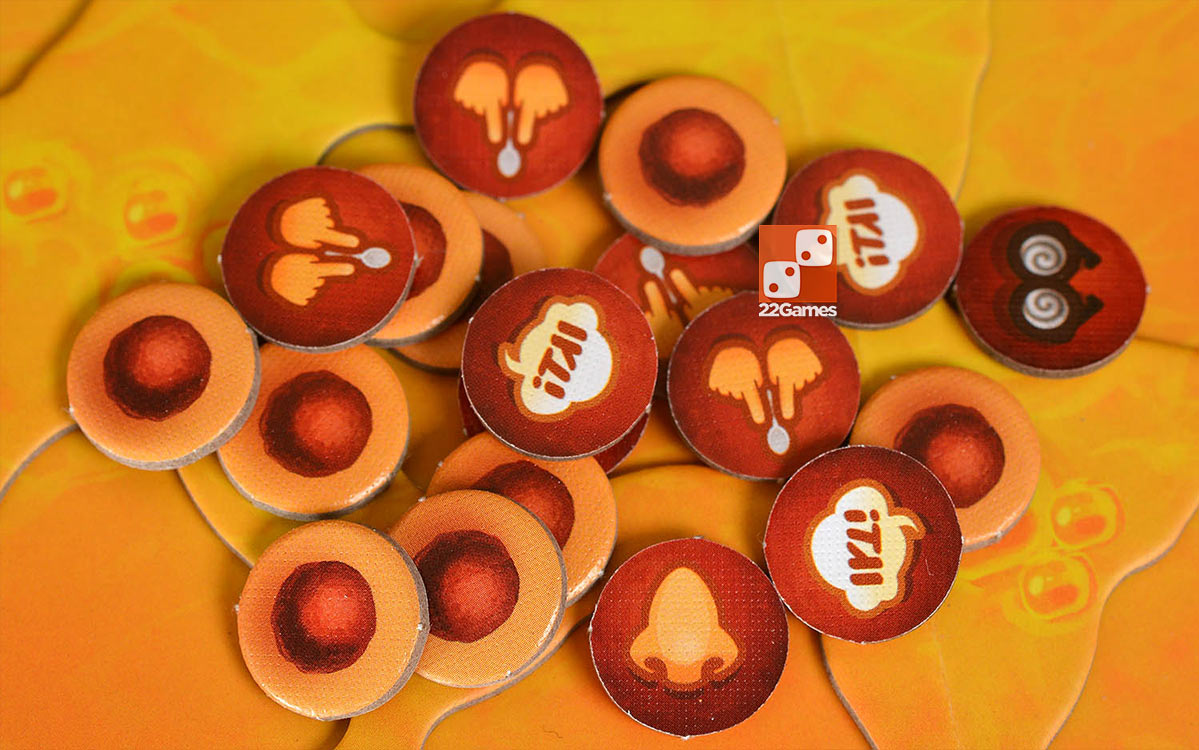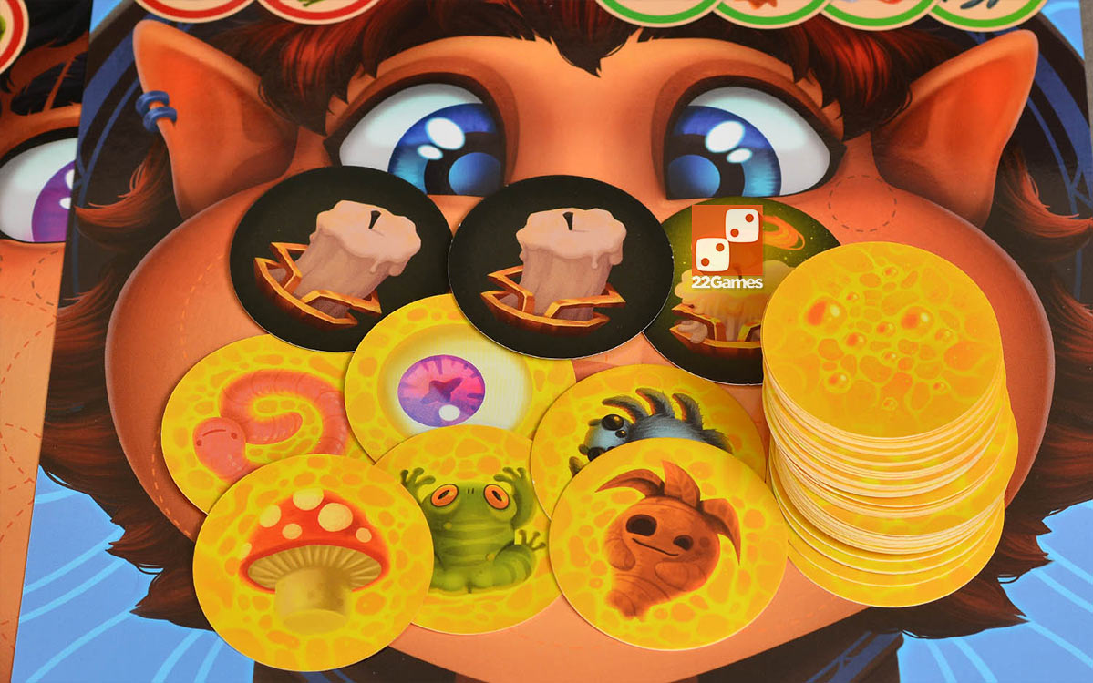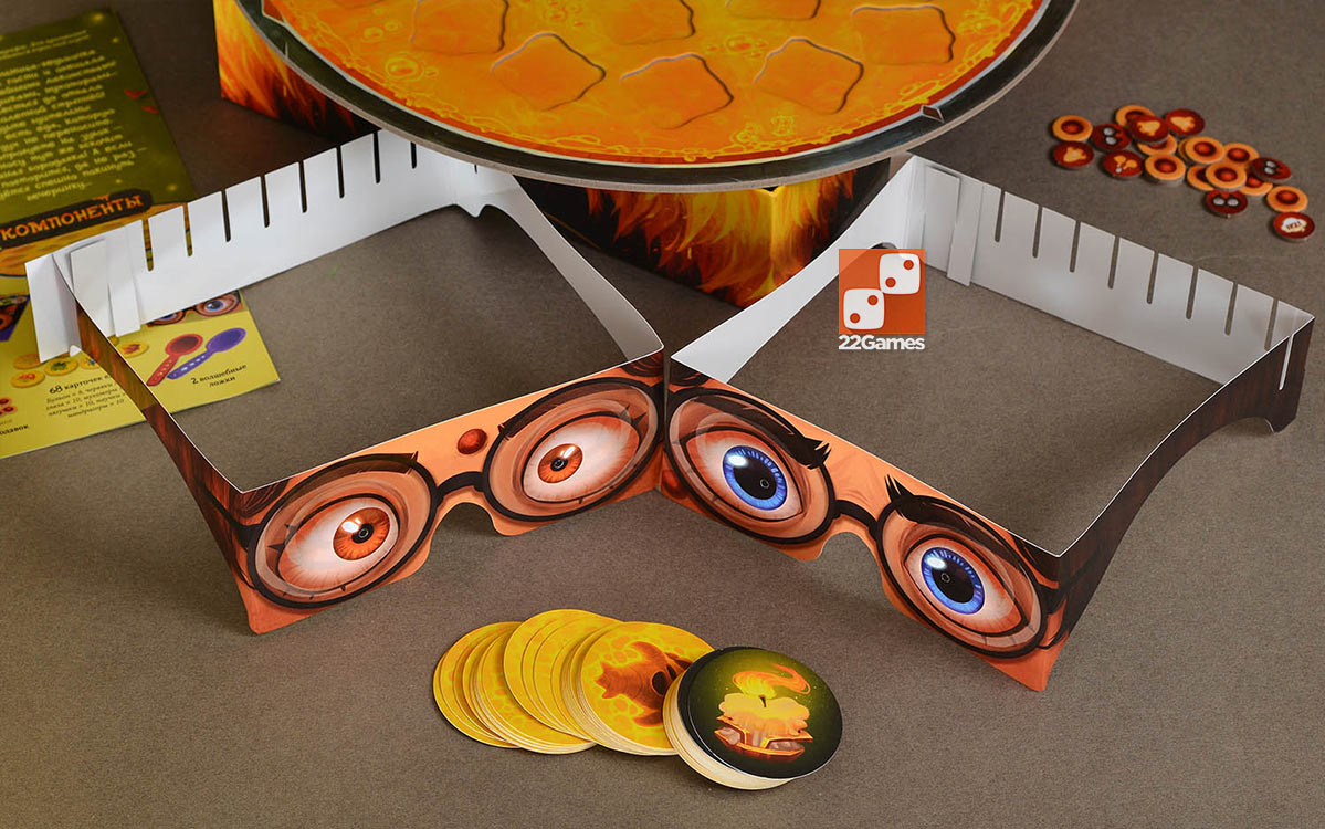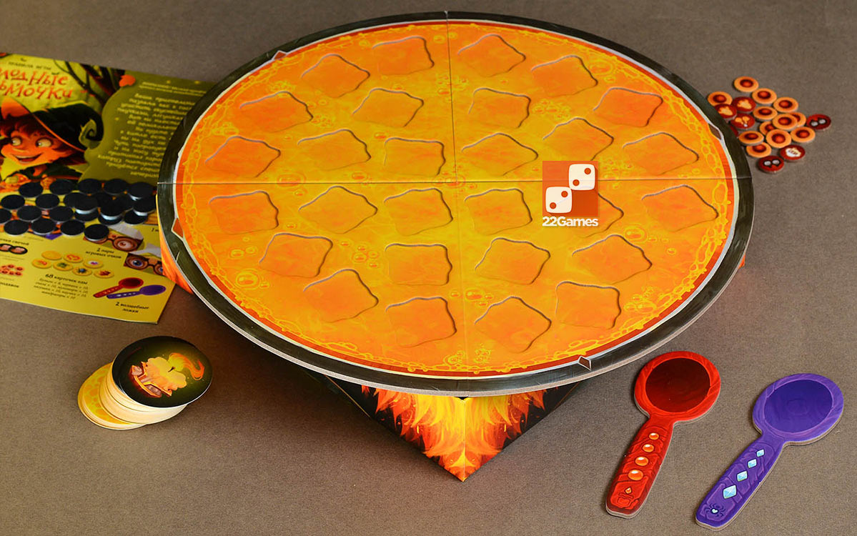 Соберите котёл, разложите жетоны соли и разбросайте в нём стартовый набор карточек еды. Самый старший участник становится Огненной ведьмой – он берёт красную ложку и карточки свечей, зажигая первую из них.