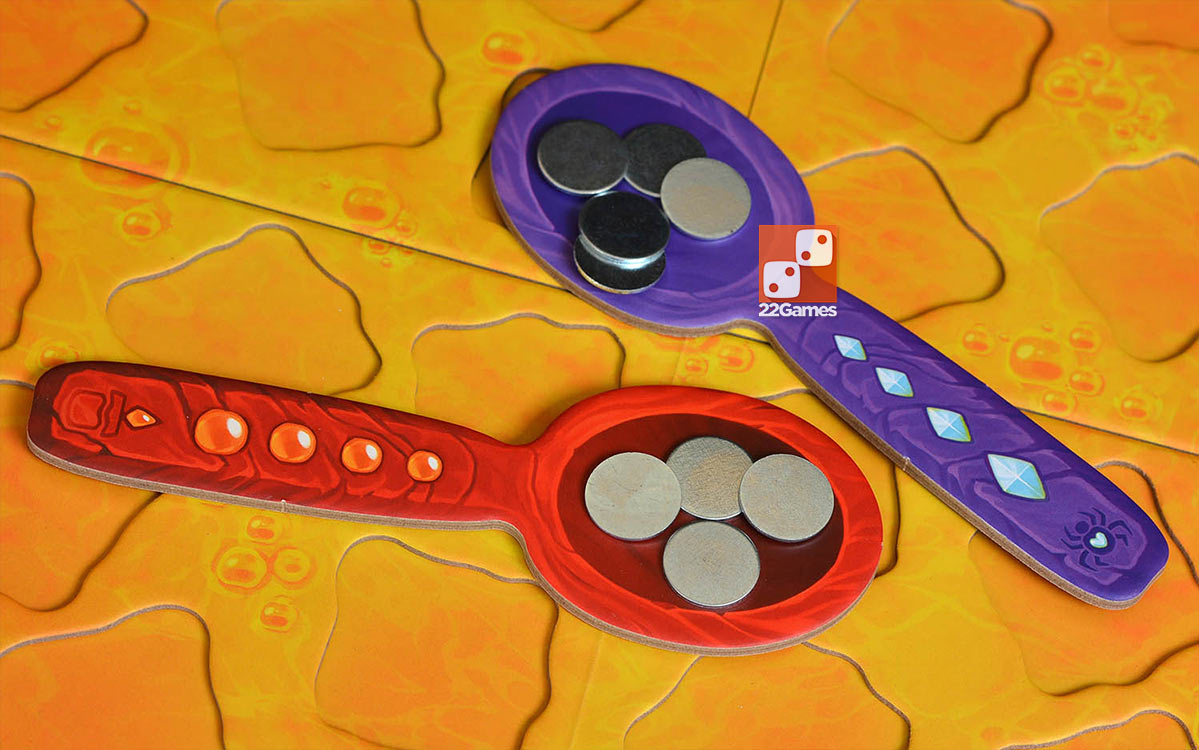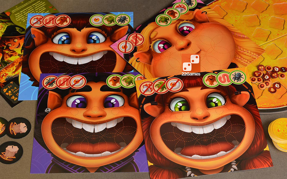 Затем вы объединяетесь в пары для поединков. Каждый участник берёт две карточки еды и по команде бросает их в котёл. А после – остаётся только схватить волшебные ложки – и начнётся самое интересное! Вам предстоит за один ловкий проход выудить из котла как можно больше лакомств. Сверяйтесь со своим планшетом: только та еда, что отмечена зелёным цветом, принесёт вам победу. Ведите ложку уверенно, подцепляйте съедобные карточки, отодвигая те, что могут наградить вас противной бородавкой! Тот, кто закончил первым, начинает обратный отсчёт. После этого проверьте улов: берите бородавку с особым эффектом за каждую вредную еду, оставляйте не более четырёх съедобных карточек, а бульон возвращайте в котёл.