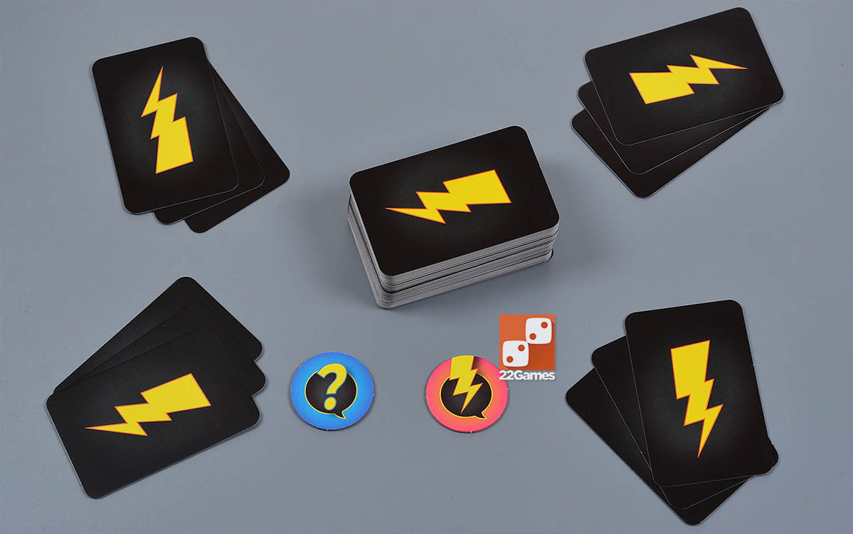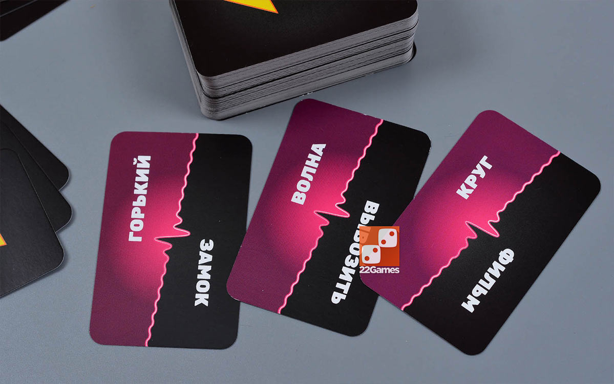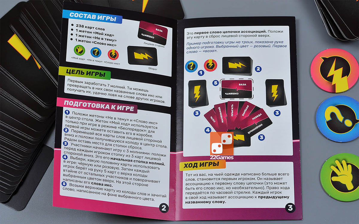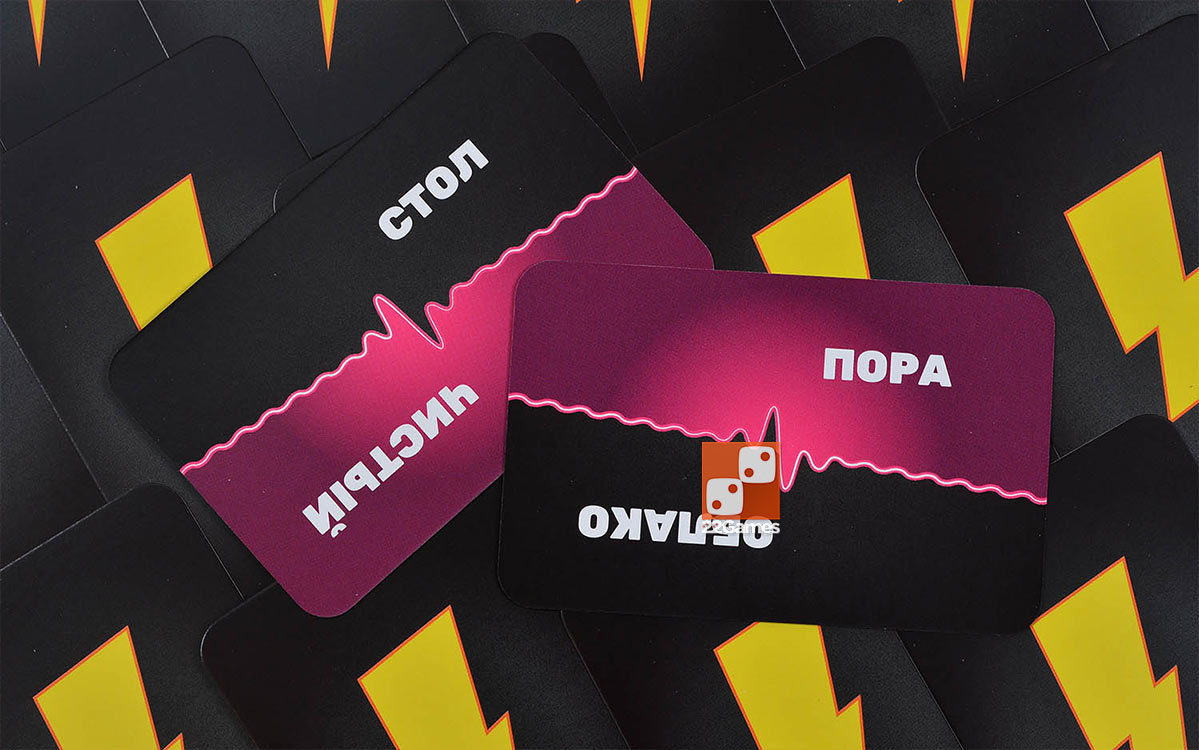 Каждая карта разделена на две половины: розовую и чёрную, а на обороте изображена молния. Для начала определитесь, какой цвет вы будете использовать. Затем раздайте игрокам по 5 карт и набор из 3 молний. Слова, написанные на выбранном цвете, и будут вашими словами-икс. Затем раскройте верхнюю карту колоды – это начало вашем ассоциативной цепочки.