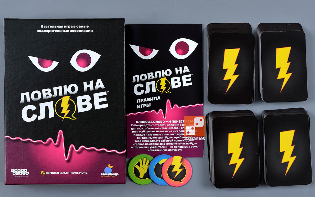 «Ловлю на слове» – это настольная игра, в которой вам нужно будет выстраивать цепочки ассоциаций, при этом внедряя в них свои «икс-слова» так, чтобы никто не заподозрил подвоха. Сможете, и получите молнию, а это крайне полезно, ведь итоговая цель – собрать 7 молний! Внимательно наблюдайте за соперниками и не стесняйтесь подлавливать их на слишком очевидной смене темы и попытке внедрить своё слово икс – так вы сможете украсть их молнии и ещё быстрее приблизиться к победе!