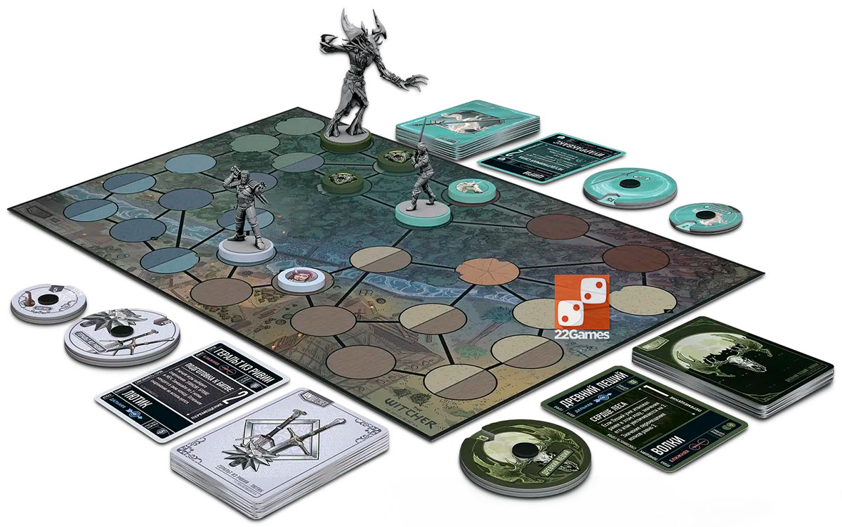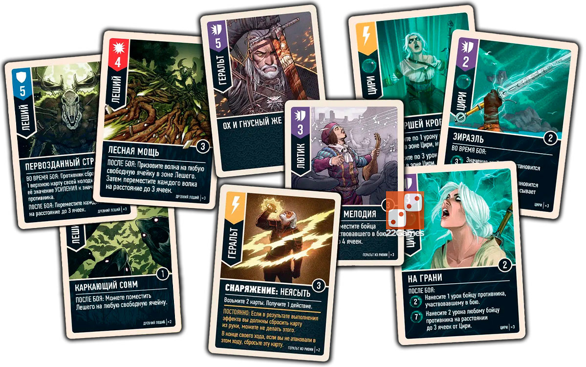 Поле боя в игре двухстороннее, с двумя новыми картами для битвы. В Ферлундском лесу стандартное разделение на цветные зоны. А поле в Каэр Морхене будет влиять на перемещения игроков благодаря своим особенностям. Каэр Морхен находится далеко на севере и славится своей скрытностью и неприступностью. Поэтому по некоторым ячейкам на поле ваши бойцы смогут перемещаться только в одном направлении – по оранжевым стрелкам. Как знать, не окажется ли очередной манёвр дорогой в один конец?